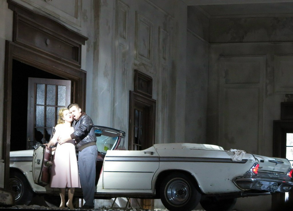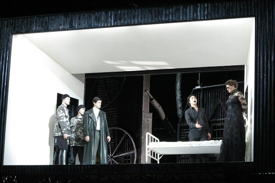 Все три действия происходят в таких сценических руинах. Как поясняется постановщиками, действие оперы перенесено в США в шестидесятые годы, прототип Лючии – Жаклин Кеннеди, Эдгар - Джеймс Дин. На протяжении всего действия в обиходе главных героев довольно много оружия, мне лично аналогия с Кеннеди показалась достаточно натянутой: скорее создавалось впечатление гангстерской драмы с враждующими двумя кланами и с преобладанием жестокой патриархальности. Именно такому миру пытается противопоставить себя Лючия, но, в итоге, находит свою свободу в безумии и смерти.