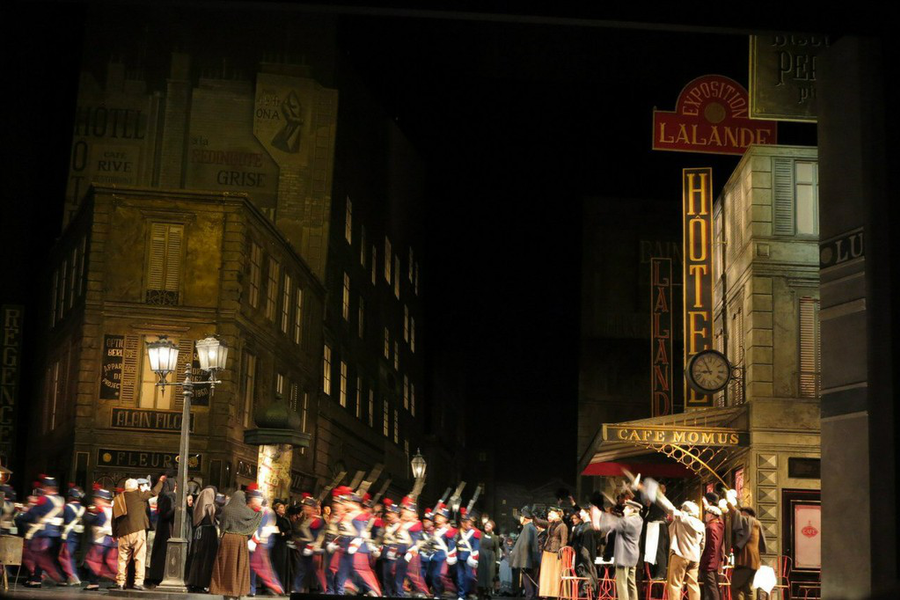 В день спектакля на Мюнхен обрушился снегопад, движение встало, здесь это чрезвычайное происшествие. Спектакль был задержан на пять минут, было много опоздавших, но обилие снега было прекрасным сопровождением для «Богемы»… Постановка 1969 года легендарного Отто Шенка, классическая сценография, мне даже показалось, что в толпе возник образ Анри Мюрже… Возле Café Momus множество статистов, изображающих парижан. Только еще Франко Дзеффирелли умел управлять таким огромными количеством народа в пространстве сцены, но, в отличие от него, у Шенка не ощущается перенасыщенности, людей ровно столько, сколько должно быть, кафе то, которое было на самом деле… Вообще, возникает впечатление полного погружения, вероятно, именно такие картины видел Пуччини, когда писал свою оперу.