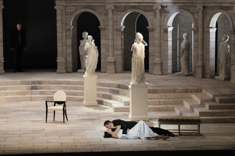 Постановка «Манон Леско» в ЛНО – довольно надуманная, громоздкая конструкция с претензией на оригинальное прочтения классики. Ее наполняют несколько кубометров декораций, представляющих собой двухэтажный амфитеатр ионического ордера с огромными арками; разнообразная, но мало удобная мебель; модная коллекция от кутюр, собрание якобы античной пластики; 22-минутный видеофильм, живописующий публике блуждания вечных Манон и де Грие по пустынной местности в окрестностях Нового Орлеана» (на самом деле в дюнной зоне Балтийского побережья); смерть Манон и ее погребение; а также набор более или менее искусственных мизансцен. Все это отдает вторичностью. Возникает ощущение, что сценограф Мартиньш Вилкарсис, художник по костюмам Kеита, видеохудожник Катрина Нейбурга да и режиссер спектакля Инара Слуцка отрабатывали гонорар, а не решали каждый свою, но общую для всех художественную задачу – типичный госзаказ с гарантированным финансированием, когда смета составляется под конкретные нужды конкретных, заранее известных подрядчиков.