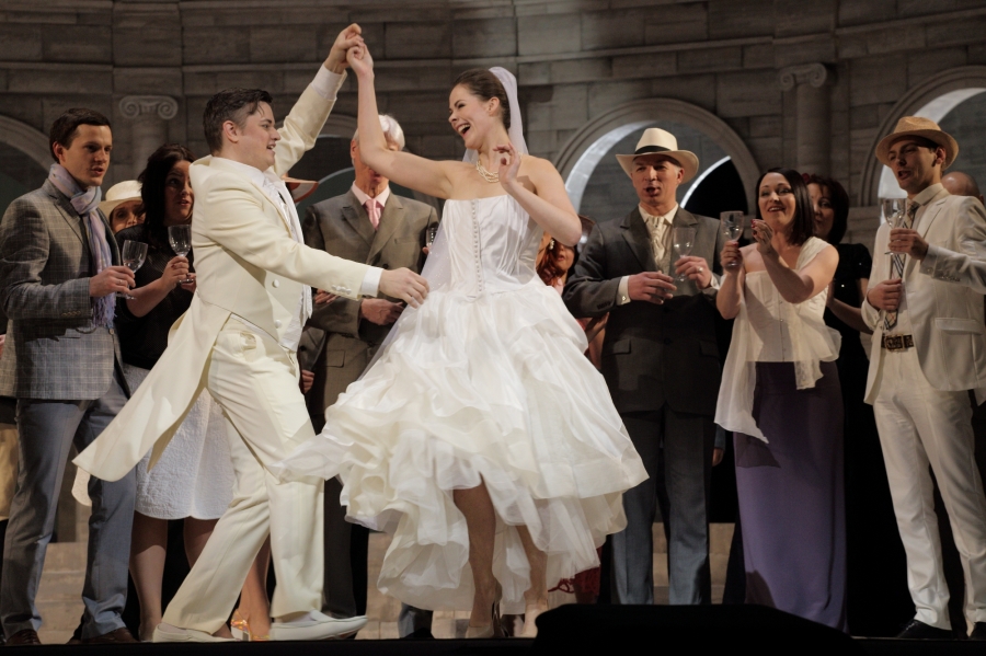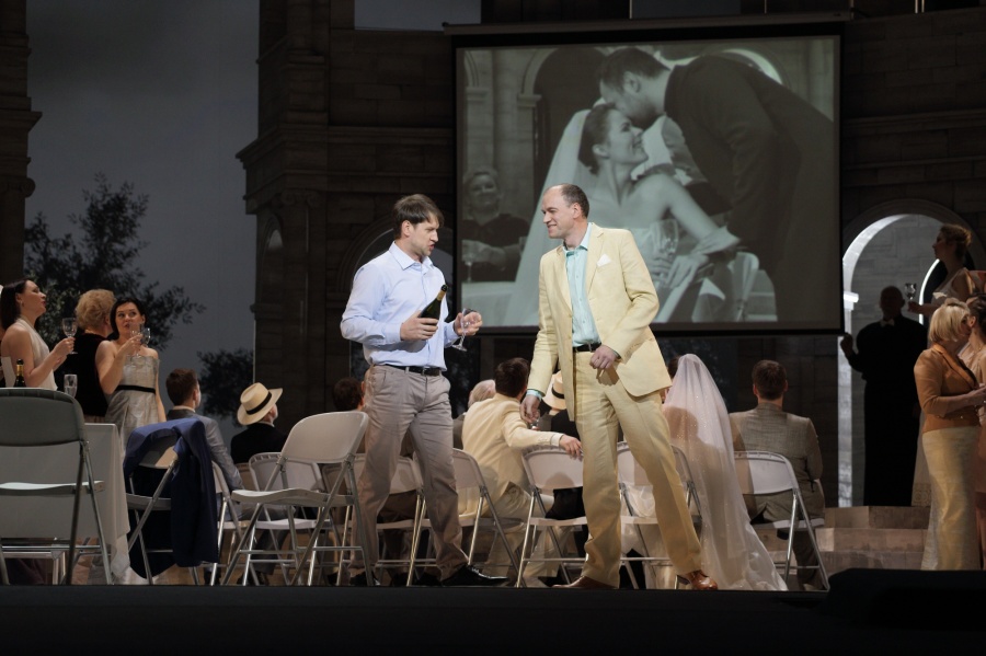 Все, что нам показали, мы много раз уже видели. Массивные архитектурные формы с элементами мультимедиа, например, в «Лючии ди Ламмермур» того же Жагарса и «Тоске» Дмитрия Бертмана (обе – 2012 год). Но там они как-то реагировали на меняющиеся условия и особенности места действия. В «Манон Леско» декорации, как кость в горле. В полукруг амфитеатра (впрочем, разорванного по середине) совершенно необоснованно вписан весь «любовный» треугольник, вершины которого географически упираются в Амьен, Париж и Гавр. В третьем действии амфитеатр предстает уже в частично разобранном виде, как бы символизируя крах надежд, но главным образом, освобождая задник для демонстрации видео в четвертом действии. Правда, остается арматура, которая графически повторяет очертания амфитеатра. И это мы тоже видели, не далее как в декабре позапрошлого года на сцене парижской Гранд-опера в превосходной постановке «Пуритан». Только в «Пуританах» ажурная металлическая конструкция, изображавшая замок во всем его объеме, использовалась по полной, поворачиваясь то так, то эдак, позволяя заглянуть вовнутрь и выйти наружу – одновременно простое и изящное, по истине универсальное решение. В рижской «Манон Леско» все сооруженное – не более, чем архитектурное излишество.
