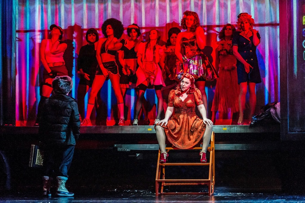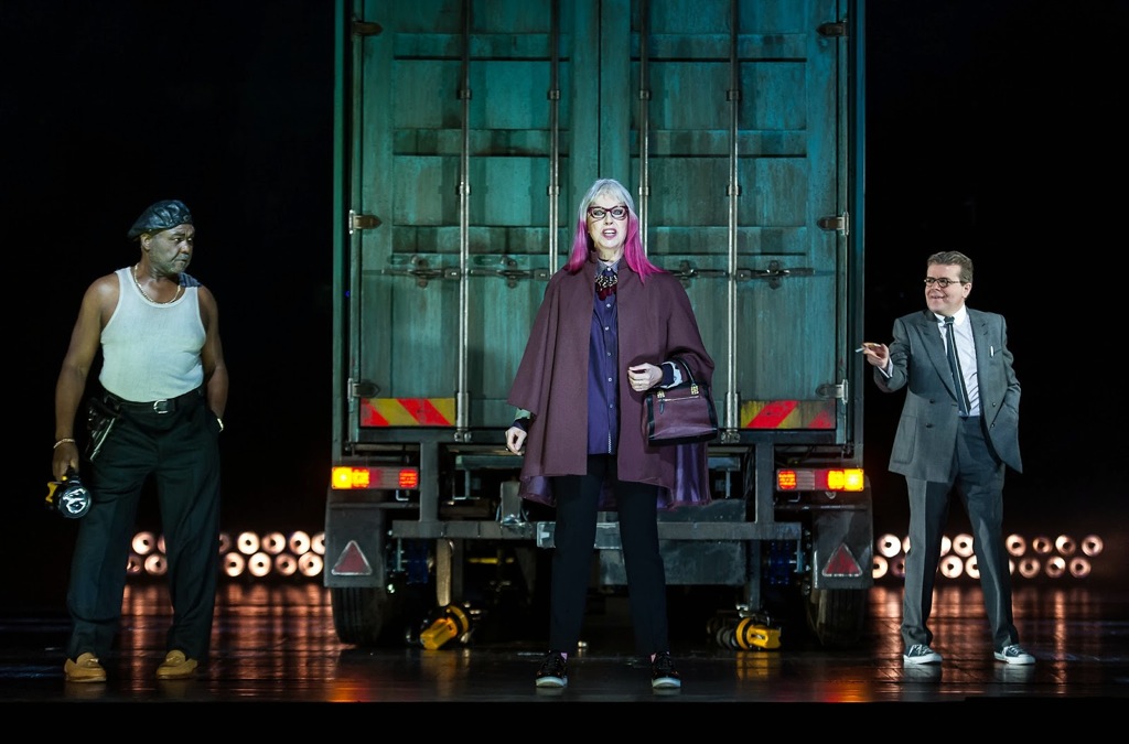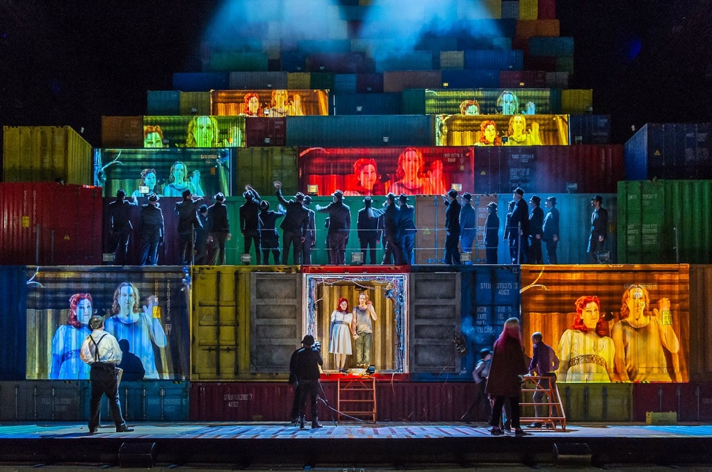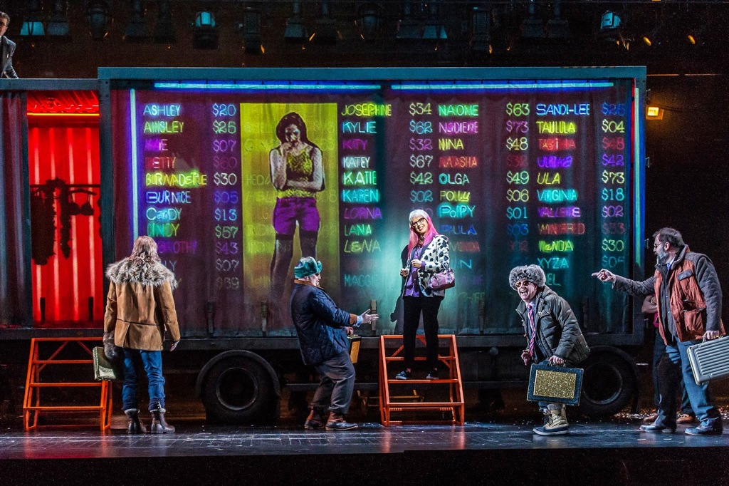 Режиссер Джон Фулджеймс со сценографом Эс Девлин нашли простое решение: все три акта происходят в морском контейнере, который достаточно эффектно перевоплощался то в борт самолета, то в кабаре с эффектным белым роялем и серебряными пальмами, то в бордель, в который выстраивалась очередь мужчин с опущенными – наготове! – штанами, а вход имитировал то раздвигающиеся неоновые «ноги» женщины, то склады, заваленные тушенкой, то… Голгофу, где распяли Джимми, и это, пожалуй, было уже слишком.