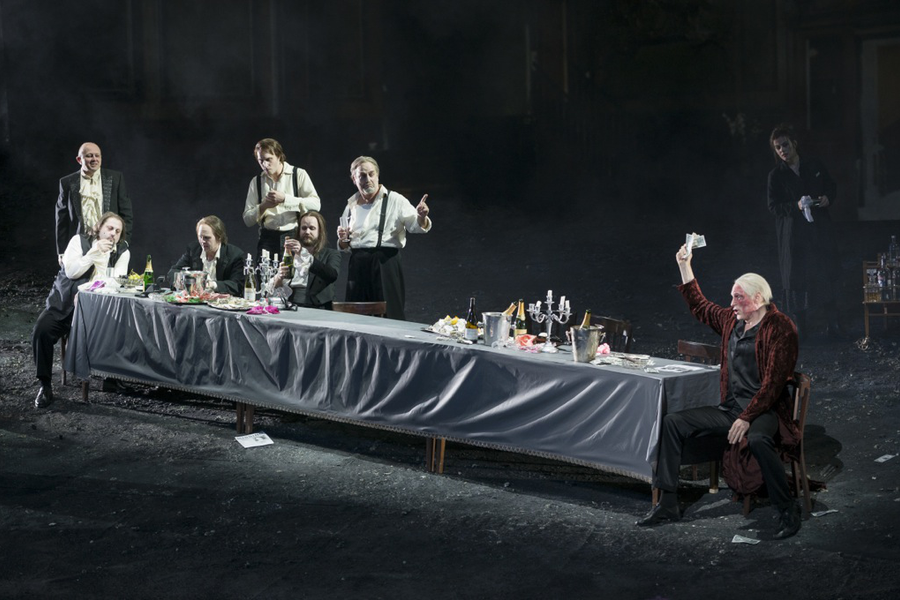 Как я понял, ад в понимании Мартона – это кризис семейных отношений. Ключевая сцена третьего действия между Орфеем и Эвридикой была решена следующим образом. Супруги с мрачными лицами, не глядя друг на друга, садятся есть суп, и в конце концов Эвридика устраивает Орфею скандал из-за того, что он на неё не смотрит. Очень реалистично это было сделано, и вообще, Мартон производит впечатление хорошего профи – не дилетанта и не шарлатана.