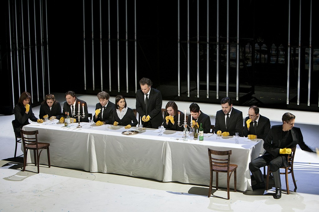 Никаких базук и ракет в спектакле нет, присутствует один пистолет и тот, ей-богу, кажется лишним и бутафорским в тонко обозначенном замысле. Христиане у Конвичного и художника по костюмам и декору Й. Лейакера отличаются тем, что кисти их рук выкрашены в светло-синий цвет (голубая кровь?), а у евреев руки жёлтого цвета, в память о шестиконечных звёздах, которые нацисты обязали их нашивать на одежду. Принц Леопольд, муж принцессы Евдоксии, христианин, соблазняющий Рахиль, персонаж "и нашим и вашим", прячет свои лояльно-синие руки под жёлтыми перчатками, которые снимает и надевает в зависимости от нужды. Будучи застигнут и теми и этими, он старается сохранить перчатку хотя бы на одной руке и, соответственно, держаться к противоборствующим группам правильной стороной, а если это не удаётся, моментально суёт руки в карманы пиджака, демонстрируя нейтралитет. Растущий накал страстей на сценическом пространстве без лобового тыканья указкой в карту и пальцем в ауйсвайс постоянно напоминает: ни антисемитизм, ни любой другой вид ксенофобии не исчезнут никогда, пока будут существовать шовинистические убеждения, что какой-то народ – весь целиком – мешает жить и дышать тебе (ему, им, тем, этим) персонально. Поразителен финальный ансамбль первого действия (по партитуре – конец третьего акта), когда агрессия зашкаливает: все участники сцены, и хор и солисты, становятся частями общего военного конвейера, производящего динамит для поясов шахидов, работая с неумолимой чёткостью. При этом обнаруживается, что руки у всех участвующих в изготовлении взрывчатки совершенно разного цвета: зелёные, красные, чёрные и т.п. – вроде цветов олимпийских колец.