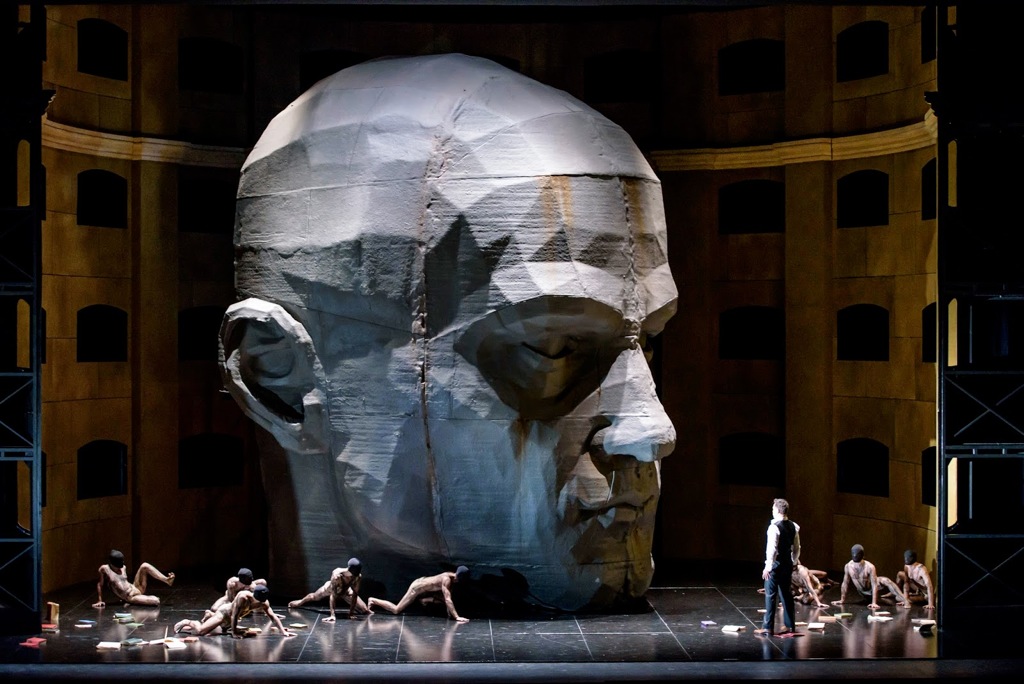 Рассеивается темнота, проявляя очертания огромнейшей головы мужчины – это голова Короля Рогера. Режиссер поставил перед собой достаточно амбициозную цель – показать визуально, что происходит в наших головах: как рождается мысль, зреет, пока, наконец, не превращается в своего рода идею фикс. В зависимости от подсветки меняется выражение этого лица – сначала серое, окаменевшее, с отсутствием всяких эмоций, затем появляются красновато-черные краски и лицо оживает, возникают желтые оттенки, цвета нежнейшей первой листвы – кто знает, что должны передавать эти цвета: какие чувства, какие страсти или наоборот – их полное отсутствие, или только – покой, безразличие (сценограф – Штеффен Аарфинг, свет – Джон Кларк).