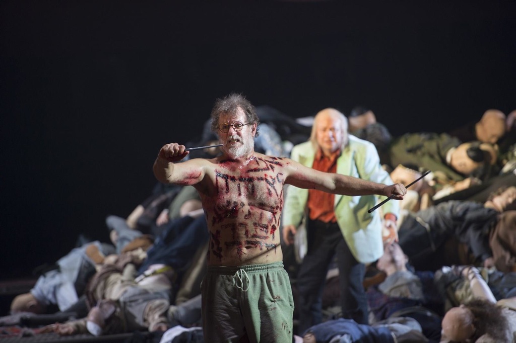 Бас-баритон Роберт Хэйворд в роли Моисея почти не поет. Партию в манере sprechgesang, символизирующую по воле композитора косноязычие героя, исполнитель не старается пропеть, напротив, доводит до бессвязной заикающейся речи, в первых картинах буквально выдавливая из себя каждое слово с таким трудом, что зритель сам начинает задыхаться. В финале этот забитый старик превращается в воинствующего борца, совершенно подавляя непреклонной волей своего ловкого, но тщедушного брата. Арон, избранный донести идею до народа, поет элегантные колоратуры, его музыкальная речь подвижна, изящна и всегда имеет определенный жанровый оттенок. К сожалению, мне не удалось послушать в этой партии Джона Дашака, вошедшего в спектакль буквально за месяц до премьеры и, по отзывам прессы, блестяще исполнившего свою партию. Андреас Конрад из второго состава работал со стопроцентной отдачей, но его не очень свежий голос оставлял желать лучшего.