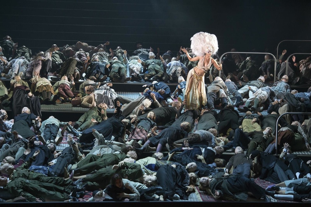Во втором акте местечковый фарс превращается в национальную трагедию. Неспособные существовать с абстрактной идеей незримого Бога, люди, как известно, создают Золотого тельца. Он материализуется из кинокадров в образе звездной танцовщицы кабаре, обещающей сладостное забвение в чувственном экстазе. Ручку старой кинокамеры крутят дети в масках трех уроженцев Вены, трех создателей великих утопий ХХ века — Теодора Герцля, Зигмунда Фрейда и мастера немецкого киноэкспрессионизма Фрица Ланга, снявшего фильмы о преступных психиатрах-гипнотизерах Калигари и докторе Мабузе. Так, в кульминационной точке оперы режиссер соединяет разрозненные нити своего сюжета. Внезапно человеческая масса удваивается за счет ростовых кукол — это евреи: религиозные, ученые, женщины, дети, солдаты, — и двадцатиминутный экзальтированный танец вокруг Золотого тельца превращает в страшную реминисценцию Холокоста. Апофеозом жестокой оргии становится «священная» жертва: покалеченные и изодранные в клочья обезумевшими людьми куклы летят в одну кучу, образуя гору обезображенных тел… И вдруг театральная условность обретает выразительность документальных кадров. Экспрессионистскую картину довершает тощая фигура полуобнаженной старухи, замершей посреди сцены в лохмотьях наряда звезды кабаре с раскрытым в беззвучном крике ртом.
