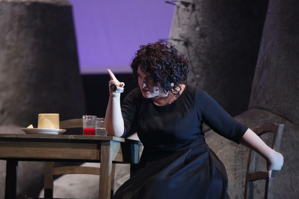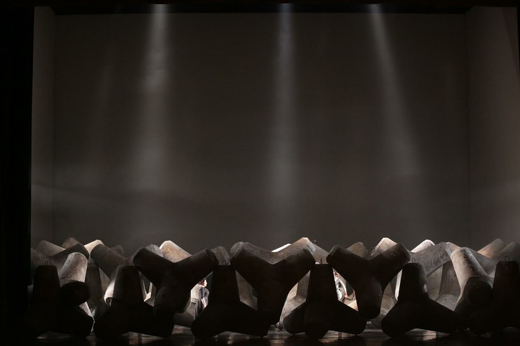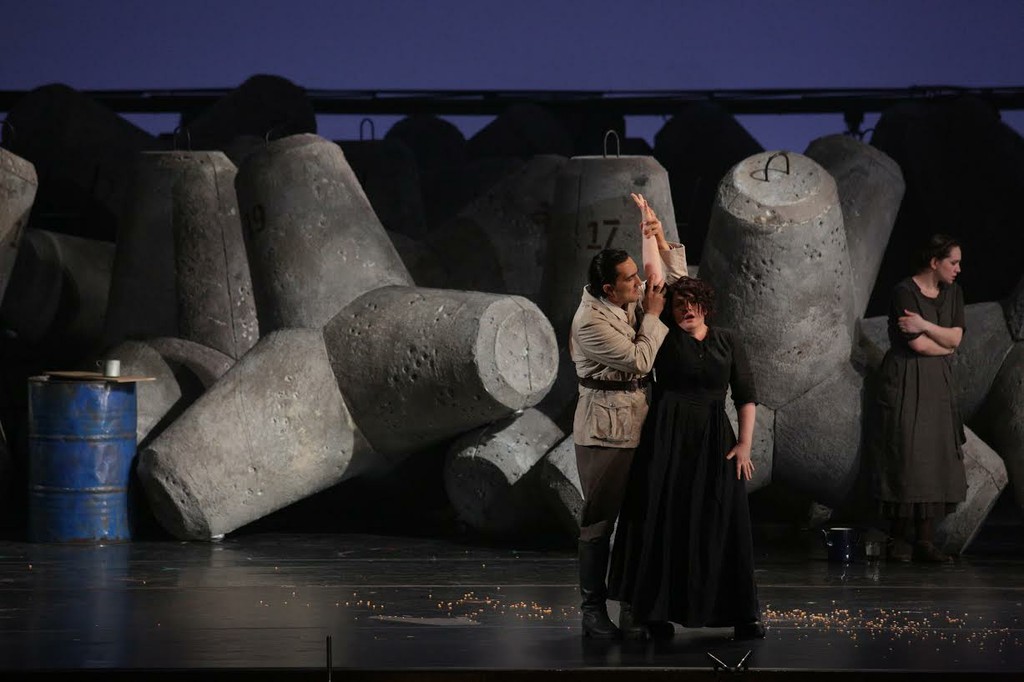 Поначалу может показаться, что Титель сознательно недоговаривает чего-то, провоцируя многозначность, вуалируя какие-то намеки, может быть и социально-политические предостережения. Такова концептуальная составляющая замысла – как говорится, дальше «думайте сами, решайте сами». Но кое-какие детали говорят об обратном – о досадных неиспользованных возможностях. В качестве наглядного примера показательна роль пресловутых тетраподов. Надо признать, что эти бетонные блоки – счастливая сценографическая находка художника-постановщика Владимира Арефьева. Они не только указывают место действия, но и оказывают сильное психологическое воздействие своим обликом и мрачным нагромождением, создавая точный эмоциональный фон сценической обстановке. Особенно это проявляется в 3-м акте, который по своей визуально-психологической органике выгодно выделяется на фоне двух первых. Именно здесь Титель вдруг перестает метаться между бытовой конкретикой и метафоричностью происходящего. В сочетании с изобретательным освещением (художник по свету – Евгений Виноградов), отбрасывающим тени, этот лабиринт тетраподов, среди которых с трудом пробираясь движутся герои, то пропадая из поля зрения публики, то вновь появляясь, создает атмосферу, в которой действие обретает мощное символическое звучание. А финальное их обрушение венчает картину, достойную скульптурного античного мифа! Если же добавить, что тетраподы пронумерованы, и символика этих цифр может быть разгадана (оставляю этот намек будущим зрителям), невольно сожалеешь о том, что такая стилистика не распространяется на весь спектакль – ведь одна лишь перестановка этих зловещих бетонных монстров и конфигурации цифр на них в зависимости от этапа развития сюжета способна сказать больше, нежели множество бытовых штрихов. И не нужно тогда ни особых примет времени, ни намеков на место действия. Сценический язык оперы становится конгениальным музыкальному, а все действо обретает универсальный вселенский смысл. Может быть Титель и задумывал спектакль как эволюцию постановочного стиля от приниженной конкретики к монументальной обобщенности финала? Должен признаться, что мне так не показалось, во всяком случае, никакой художественной подготовки к такой метаморфозе не ощущалось. Но это все фантазии рецензента – мы видим, то, что видим, а из песни, как говорится, слова не выкинешь. Дальше разбирать по косточкам постановку не имеет смысла, ее нужно видеть, и каждый увидит свое…