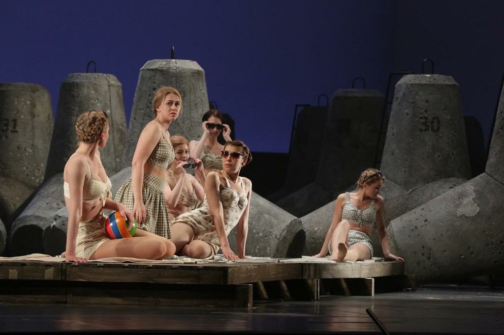 Время? Двадцатые-тридцатые годы прошлого века, о чем недвусмысленно намекают покрой пляжных костюмов купальщиц (подруг Главки), ритмы джаз-банда и еще кое-какие мелкие детали. Место? Тут можно как Шерлок Холмс идти методом дедукции от общего к частному. Волнорезы-тетраподы (о которых ниже) и пляж – значит море, обилие светлых одежд – скорее всего, море южное. Некоторые дополнительные светские приметы, те же пляжные костюмы или официант, прислуживающий Главке, выдают европейский уровень цивилизации. Православный священник в сцене свадьбы Ясона и Главки указывает, скорее всего, на Грецию, вряд ли на Россию с немыслимым в те годы религиозным свадебным обрядом. Именно здесь обретается Креонт. А откуда тогда Медея? Ее черное одеяние с характерным головным платком-убором, тяжелая физическая работа наподобие таскания мешков и бочки с водой, чистка кукурузных початков выдают южную женщину традиционной культуры. Титель ничего не делает просто так: кукурузная каша очень популярна в Абхазии. А где Абхазия, кстати, родина Герзмавы, там и Колхида. Вот какая получается вполне предсказуемая география. Но далее начинаются игры в «прятки» – непонятная и мятая военная форма (расхожий штамп современных оперных постановок, постоянно о чем-то «предупреждающих» мир), «аргонавты» в белом со своим загадочным и невразумительным «руном» в каком-то цветистом восточном сундуке, странное поведение Ясона, постоянно падающего в обморок. Ну, еще финальный обморок – куда ни шло, можно вообще предположить, что герой умирает (хотя по либретто это не так), но возникающая перекличка с аналогичным обмороком в 1-м акте заставляет задуматься – что бы это значило? Если добавить к этому странные и никак не откомментированные намеки в буклете на террористическое прошлое Ясона, то удивление только нарастает – такая «чувствительность» героя не вяжется с образом жестокого убийцы и грабителя – дерзкого похитителя Золотого руна.