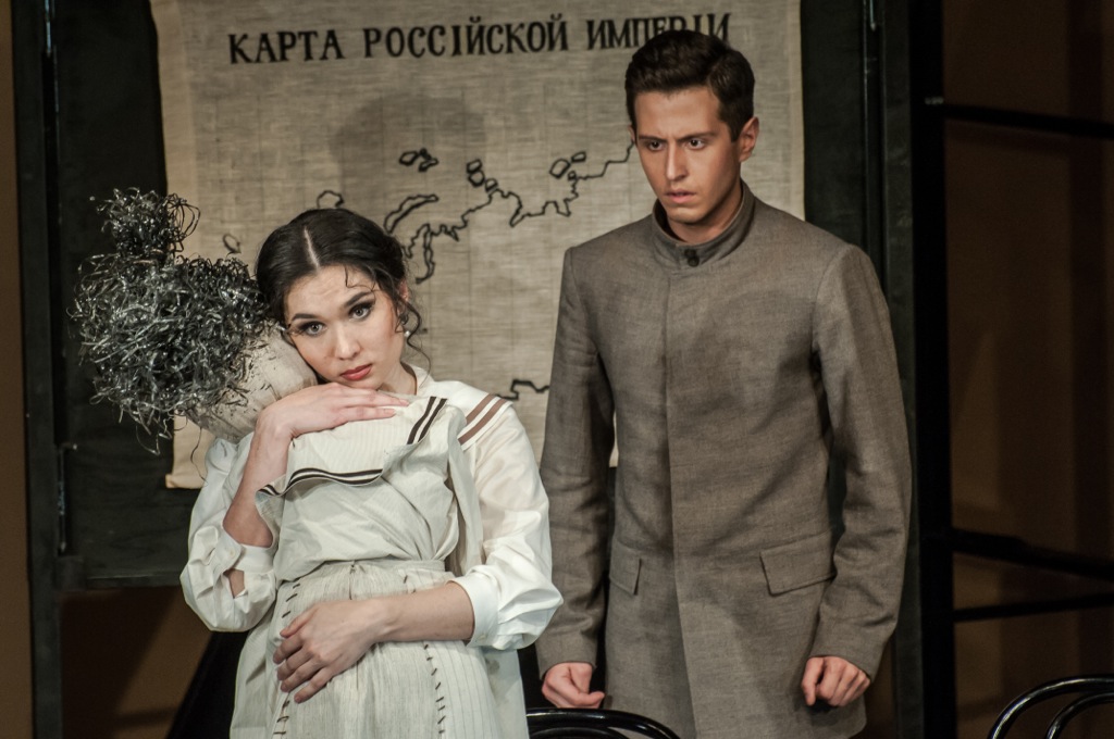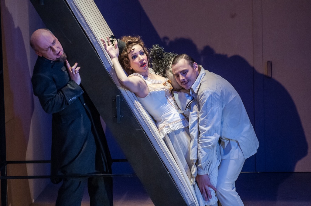 Иначе, нежели блистательной, работу режиссера-постановщика Георгия Исаакяна не назовешь! В ней сочетаются виртуозное владение мизансценой и точное чувствование предмета инсценировки. Уж про идеальное артистическое попадание в точку в образе каждого героя и говорить излишне. Не в обиду композитору будь сказано – весьма значительная доля успеха музыки и спектакля по праву принадлежит режиссеру-постановщику и его команде, а также артистам-солистам. Спектакль пластичен по темпоритму, его зрительный и слуховой ряды конгениальны, что сыграло на руку музыке, раскрыв в ней дополнительные чувственные акценты. Наличие кукол-двойников придало действию метафорический объем и усилило элемент игры. В самом действии нет пустых мест, удачно и в полном союзе с музыкой решены переходы между многочисленными картинами и сценами. В этой связи можно добавить, что сценография (Степан Зограбян) лаконична и функциональна. Сцена не загромождена и лишена исторического натурализма, а роль знаковых примет времени и некоего литературного флера выполняют костюмы (Наталия Войнова). Возможно, кому-то покажется, что использование лестниц и балконов – прием не новый, особенно в этом театре. Но, во-первых, сценографическое цитатничество (весьма здесь умеренное) тоже входит в джентльменский набор постмодернистских приемов; во-вторых – и это главное – такая «этажность» является эффективным способом преодоления стесненного пространства небольшой сцены Камерного театра, особенно в условиях многонаселенной пьесы.