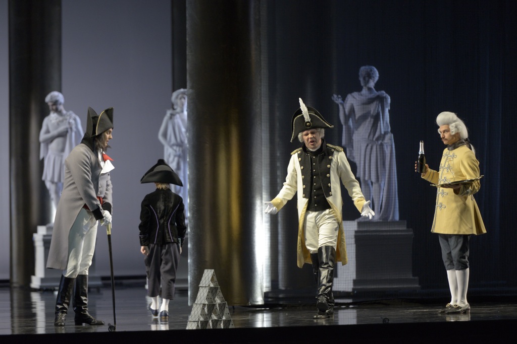 Ещё о неслучайных, я думаю, ассоциациях: подчёркнуто не старческая пластика Графини, темпоритм её сценической жизни, стянутые белой сеткой волосы, когда снят нарядный парик, – особенно, если на сцене не слишком хорошо поющая, но стройная Мария Максакова – рождает отдалённые аналогии с хореографическим образом, созданным Роланом Пети для Илзе Лиепа в балете «Пиковая дама» Большого театра 2001 года. А оживающие статуи – привет польскому акту «Бориса Годунова» постановки Тарковского 1990 года. И, наконец, явно витающий над спектаклем призрак императора, встающего из гроба «…в двенадцать часов по ночам». Жуковский-Глинка. Все это не заимствования. Это пласт-фундамент, связки с далёким и не таким уж далёким прошлым нашей культуры.