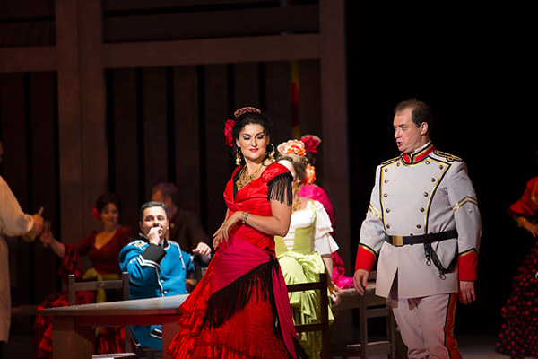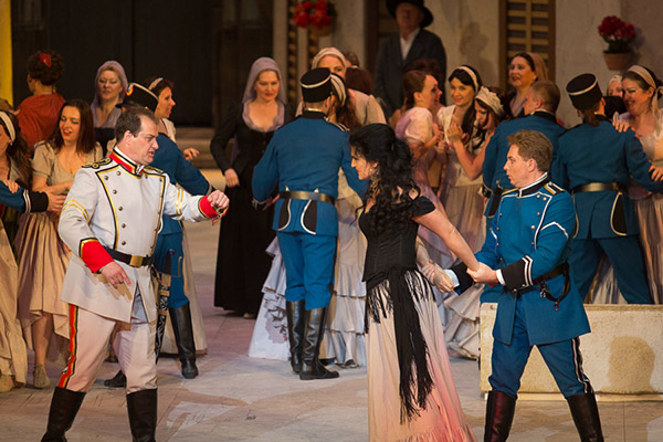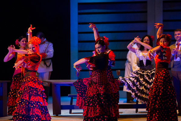 Действительно, спектакль получился ярким, красочным, праздничным, он понравился зрителям. Мантильи, розы в волосах, платья с многочисленными воланами из ткани «в горошек», мониста, серьги и браслеты из мелких монеток. Трогательные умилительные детишки, марширующие вместе с солдатами в первом акте и изображающие юных участников корриды в четвертом. Артистки хора и солистки, освоившие испанские танцы под руководством приглашенного специалиста по фламенко Елены Алипченко. Достаточно свободно управляющаяся с длинным хвостом своей bata de cola (специальная юбка, обязательная принадлежность костюма танцовщиц фламенко) во время второго акта Кармен. Яркие костюмы взрослых участников корриды. Глаз, несомненно, радуется! Видно, что художник и режиссер вложили в постановку душу, это своеобразное признание в любви Испании.