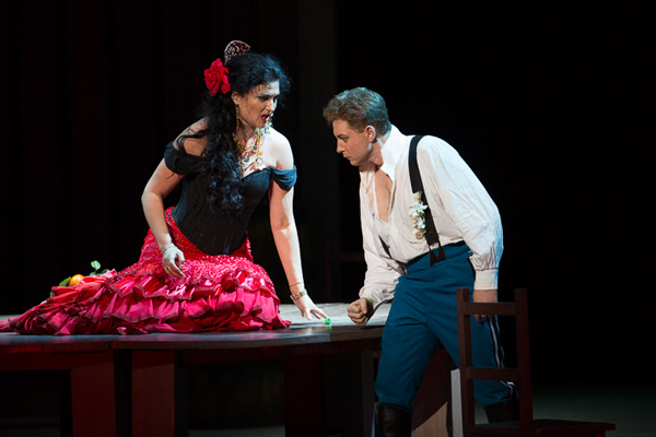 Соотнеся эту идею режиссера с тем, что было воплощено на сцене, возникает ряд вопросов. Действительно ли с заглавной героиней произошли все те изменения, о которых говорит Галина Галковская? Или цыганка до последней минуты своей жизни осталась женщиной, которая часто влюблялась, но никогда по-настоящему не любила (Эскамильо принадлежит реплика, что любовь Кармен более полугода не длится), для которой главной целью жизни было соблазнять и подчинять себе мужчину, которая была и осталась этаким Дон Жуаном в юбке? Если мужчина сразу не падает к ногам красотки, то, как в случае с Хозе, нужно пойти в «лобовую атаку»: можно плечи оголить, можно юбку приподнять повыше, можно сделать несколько танцевально-эротических па у флагштока с испанским флагом, можно, в конце концов, бросить цветок, который будет подобен пуле. Когда же очередная цель достигнута – мужчина полностью покорен и околдован – интерес к нему пропадает, а дальше… нужно поставить себе новую цель и найти новый объект для завоевания. Не случайно в знаменитой хабанере Кармен есть фраза, которая на русский язык переводится как «берегись любви моей» или «берегись, если я тебя полюбила».