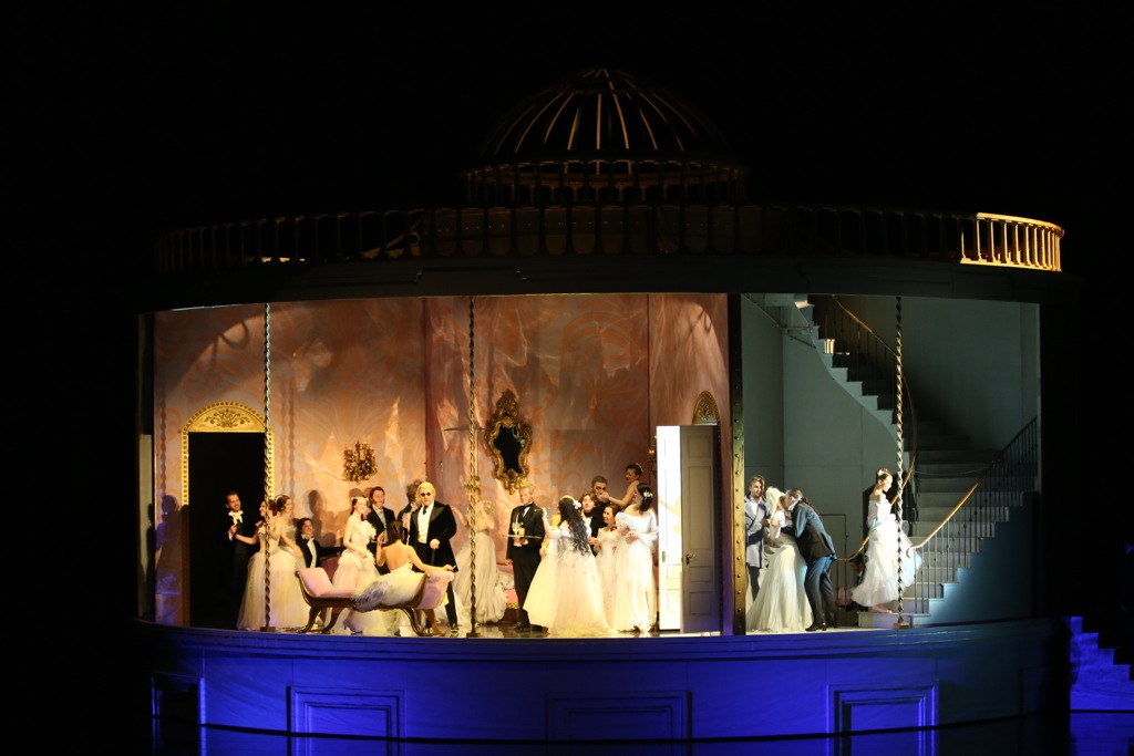 Все символы постановки очевидны зрителю, а красота сценографии радует глаз. Прекрасна, хоть и действительно несколько излишне гламурна загородная сцена, поставленная в центральном сегменте карусели, который Изабелла Байвотер называет «золотой птичьей клеткой». Эта сцена похожа на несколько наивное женское представление об Эдеме. Впрочем, по словам той же Изабеллы Байвотер, сцена воплощает «сельскую идиллию глазами городской девушки». Центральная золотая ротонда увита светлыми изогнутыми побегами, перед ней окруженный белыми лестницами зеленый холм и озерная гладь. На пейзажи распахнутых крыльями плоскостей боковых сегментов транслируется видеопроекция колышушихся на ветру цветущих деревьев, что создает впечатляющий эффект пленэра, иллюзия движения воздуха ощущается даже в зале.