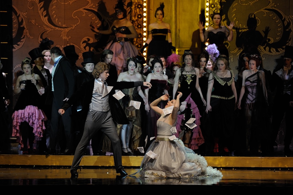Новая «Травиата» уже названа зрителями «гламурной», но, скорее, эта постановка в целом – царство традиционности и женского представления о прекрасном. Во многом в ней прослеживаются параллели с предыдущей работой тандема над «Сном в летнюю ночь». Об этом говорит и чувственность растительных причудливо изогнутых линий орнаментов, которые отражаются в темных зеркалах полов, и недосказанность соблазнительных бесчисленных наслоений прозрачных вуалей качественно выполненных костюмов, роскошь и откутюрная уникальность которых подчеркнута блеском золота мебели и светильников – почти музейных реплик, и приглушенные естественные цвета, которые контрастируют с яркостью летящих розовых лепестков видеопроекций. Многофункциональная декорация-карусель, как извечное колесо времени, вершит свой жизненный цикл, как сама судьба вращает людей со всеми их достоинствами и пороками, жаждой наслаждения, забытья и веселья, со всеми их чаяниями и надеждами на лучшее. Колесо не переставая крутится, перемалывая жизни, сминая цветение красоты и юности, даря не желанное счастье, но лишь обманное временное забытье. По замкнутому неминуемому кругу вращаются вереницы людей и вещей, раскадровка интерьеров и событий. Мизансцены замирают на несколько секунд, фокусируя внимание на главных героях и позволяя им в этом мимолетном безвременье выразить свои скрытые чувства.