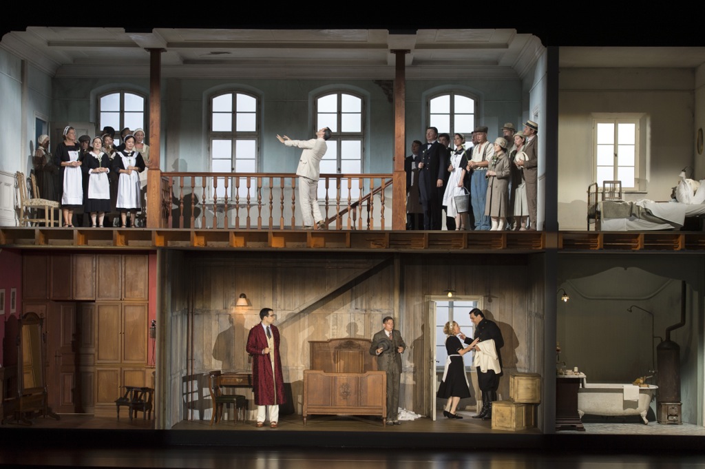 В этом доме всё великолепно отлажено, кроме человеческих отношений. Все персонажи, главные и второстепенные, постоянно подслушивают-подглядывают-подгаживают. Особенно отличаются Базилио – Пауль Швайнестер, шныряющий по дому как заправский детектив в поисках компромата, и Марцеллина - Анн Мюррей, откровенно копающаяся в вещах Сюзанны. Зато слуги идеально воспитаны. Под стать Графу. Лука Пизарони, чья элегантность в пении и манерах безукоризненна, не теряет самовлюблённой светскости даже в моменты неподдельного гнева. Отчего этот самый гнев выглядит особенно забавно.