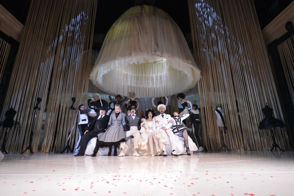 Режиссёром в Питер пригласили Игоря Коняева, художественного руководителя Рижского русского театра им. Михаила Чехова, поставившего немало драматических и музыкальных спектаклей в северной столице. А художником – Ольгу Шаишмелашвили. Талантливый сценограф и дизайнер костюмов, она, на мой взгляд, абсолютно доминирует в этой постановке. Тот случай, когда форма очень наглядно определяет содержание. Игривая череда недоразумений, рискованных положений и очаровательного донжуанства помещена под колпак дамских кринолинов. Взвиваясь вверх, они образуют красивые вертящиеся абажуры, а под ними, помимо забавного действия, зритель наблюдает изысканное дефиле: остроумно придуман, отточен по силуэту и колеру каждый костюм, а общая цветовая гамма, как и мельчайшие детали, выверены отменным вкусом. В бело-чёрно-серую линию оттенков постепенно закрадываются красные детали: клоунские носики каскадной пары, леденцовые петушки непутёвого папаши красотки- Франциски , ярко красные цветы в руках строго элегантной Графини. Второй акт выдержан в пастельных тонах нежно розовых, голубых и кремовых платьев рядом с традиционными чёрными фраками, белыми мундирами и асфальтово-серым бальным туалетом главной героини. И резким контрастом к этому – красные с чёрным балетные костюмы изощрённого силуэта. А к третьему акту и темпераментные дамы любвеобильного графа, и он сам облачаются в ярко красное – азартные страсти накалены до предела!