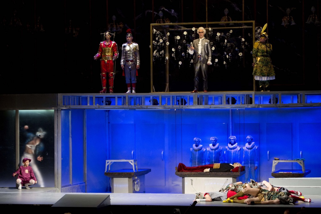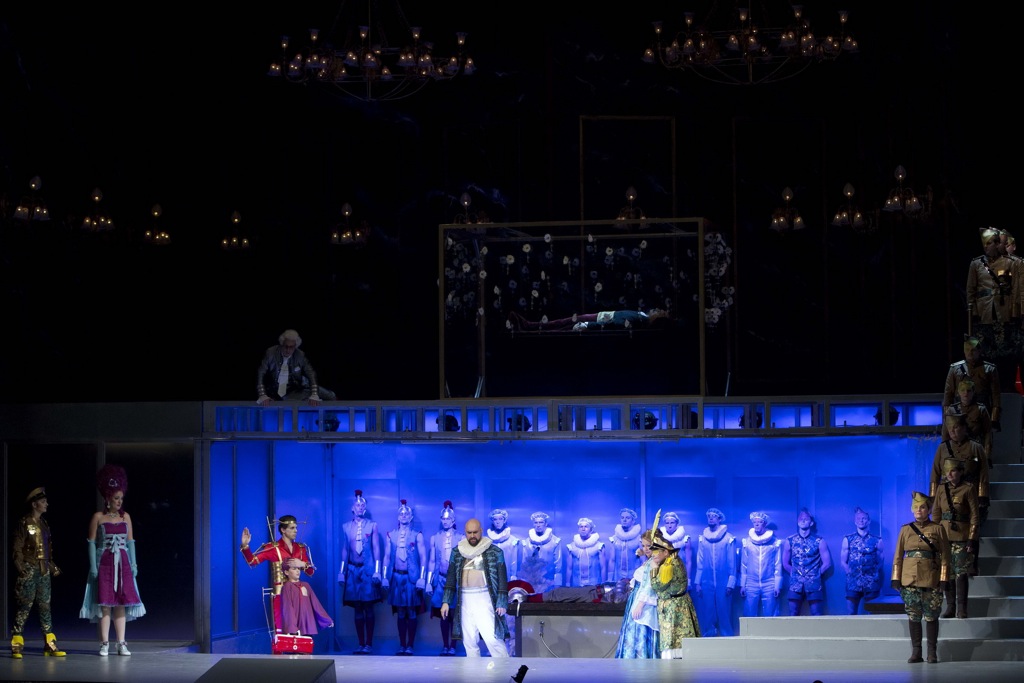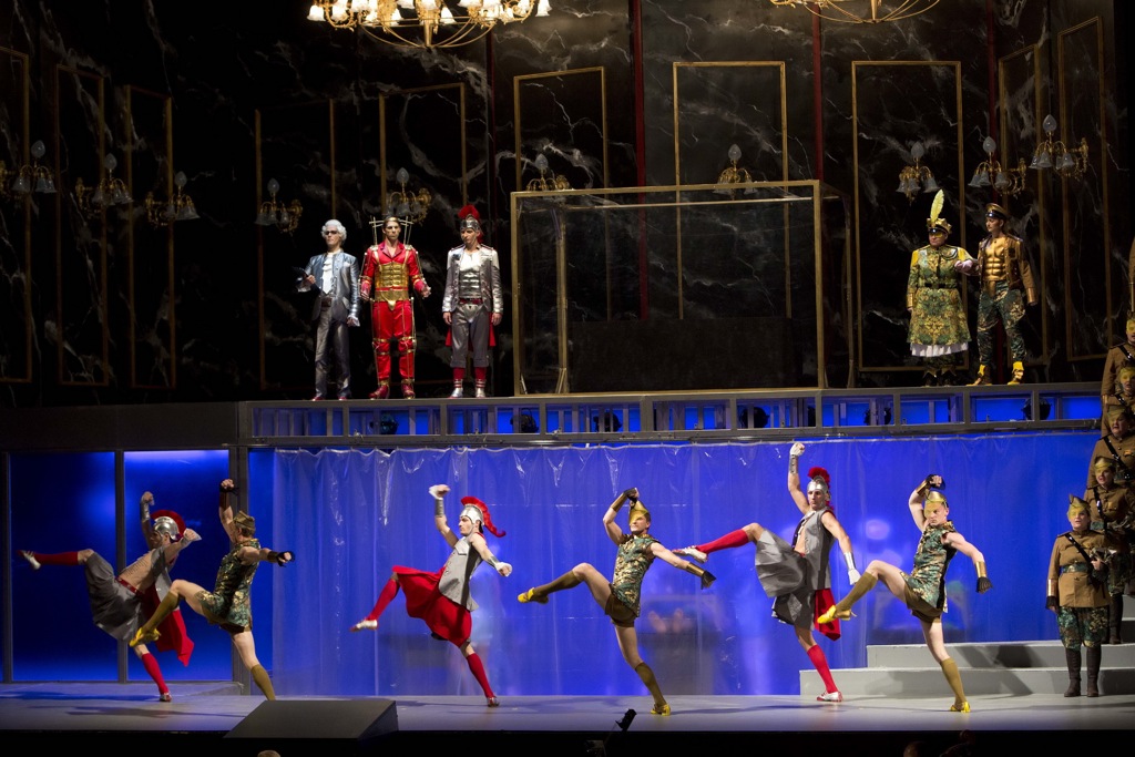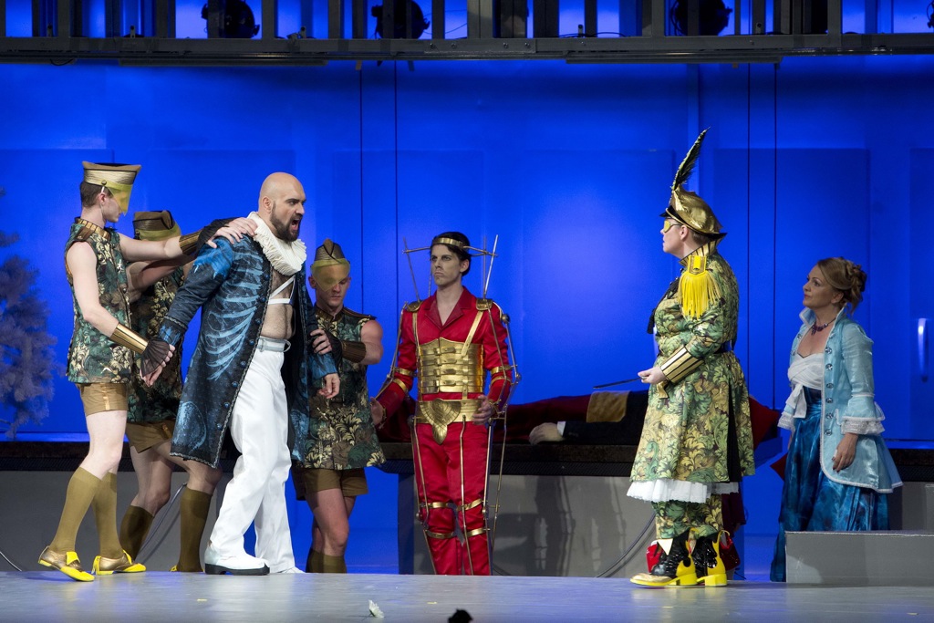 Спектакль получился экстравагантный, порой почти на грани фола, но на удивление точно отражающий принципы барочной оперы — эклектичность, элементы буффонады, хорошо просчитанные вычурные способы обыграть статичные арии, перемежающиеся между собой речитативами. Режиссер не предпринял попытки хоть как-то приблизить сценическое действие к каким-либо конкретным реалиям, скорее изобразил на сцене весьма впечатляющий коллаж из различных культур и эпох, абсурдный и на удивление лаконичный. В данном случае даже некоторый очевидный эпатаж был вполне органично вписан в общий контекст спектакля.