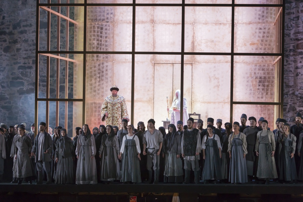 Огромный хор Савонлиннского фестиваля работает замечательно: звучание групп собрано в единую звучащую материю, таящую и тонкое пианиссимо, и отчеканенную речитацию, и мощные звуковые взрывы. Понятен хорошо произносимый русский текст, пластика выверена – никаких случайностей, все переходы точны, все эмоциональные градации читаются. Толпа то на коленях, то поднимается во весь рост, то вовсе стелется по земле, прикрывшись серым тряпьём. Или облепляет телами клеть царского терема, словно вспенившаяся волна, бьётся протянутыми руками об ограждение с криком «хлеба, хлеба». Из её же недр возникают люди, на глазах зрителя надевающие боярское платье и отправляющиеся на совет в царскую думу – всё здесь и правдиво, и условно – констатирует постановщик.
