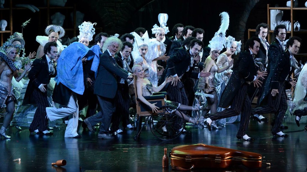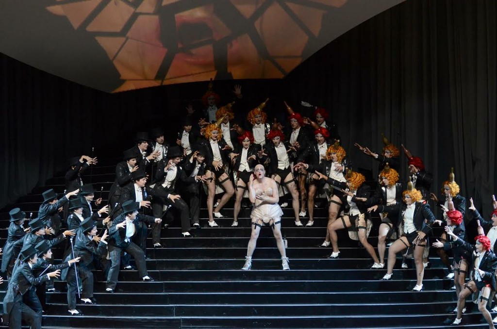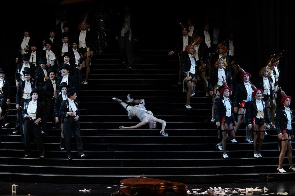 На сцене современного, вместительного и уютного зала Фестшпильхауса в Брегенце постоянный сотрудник Херхайма Кристоф Хетцер выстроил огромную крутую лестницу. Мы в театре или мюзик-холле? Хор похож на кордебалет. Girls или boys? Зрителя одолевают некоторые сомнения, и, только приглядевшись внимательнее, можно понять, что girls это boys, а boys это girls! Girls разодеты в строгое черное платье и цилиндры, а boys носят белые жилетки, черные пиджаки, чулки и подвязки. Скорее, пол живо играющих и поющих на обеих сторонах лестницы, которые, согласно либретто, являются студентами-завсегдатаями кабачка Лютера, и вовсе неопределим. Или речь идет о трансвеститах? Мгновение спустя на верху лестницы появляется женская (?) фигура, затянутая в элегантное неглиже телесного цвета и в чулках с подвязками. Стелла! Певица, мечта поэта Гофмана. И вновь сомнение. Стелла не женщина, а мужчина! Огромный, грубоватый, лишенный намека на грацию мужчина. В его руках опорожненная бутылка.... эта «Стелла» хорошенько накачалась алкоголем, теряет равновесие и с грохотом летит вниз по ступенькам, парик слетает с ее головы. Что за конфуз в вечер премьеры! После «полета» ее тело валяется в середине лестницы с растопыренными ногами. В роли Стеллы каскадер Пяр Пелле Карлссон, только опытный трюкач может скатиться с лестницы так, чтобы дело не кончилось увечьем!