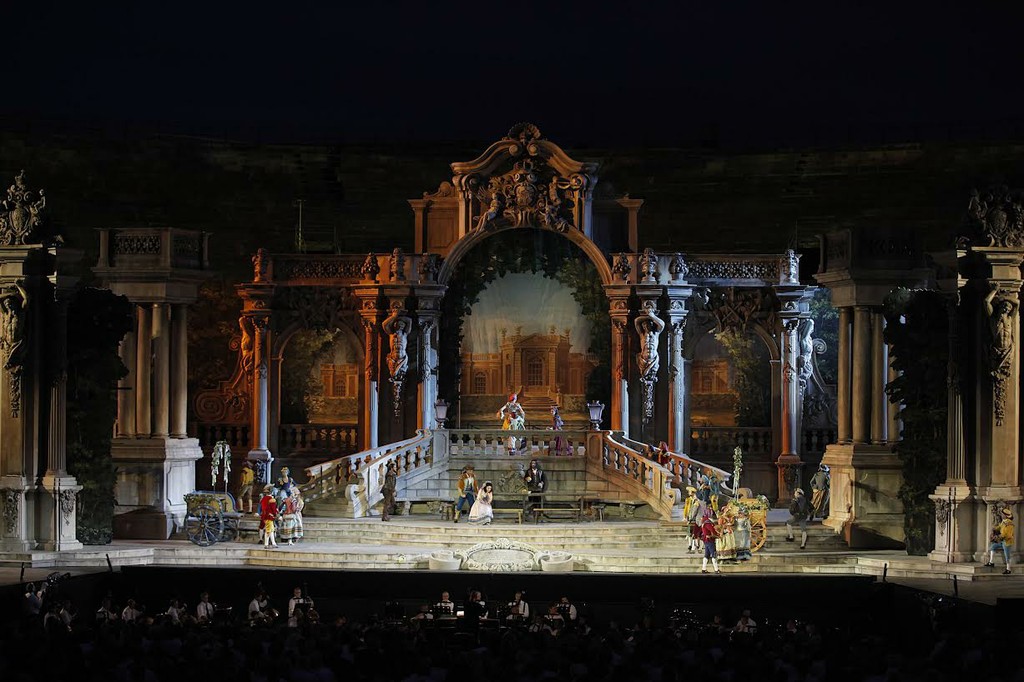 В «Цирюльнике» количество персонажей ограниченно, а сцена Арены огромна, поэтому Де Ана привлек к работе над спектаклем Леду Лойодиче, известную своими работами по сценическому движению в оперных постановках. Количество мимов и танцовщиков впечатляет; возможно, их даже слишком много, на сцене беспрерывно что-то двигается, мельтешит, играет и сверкает. В россиниевской опере задействовован великолепный состав, все исполнители – специалисты высокого класса в данном репертуаре, хорошо известные завсегдатаям Rossini Opera Festival в Пезаро. И не просто специалисты, но настоящие звезды: Джессика Пратт, Бруно Де Симоне.