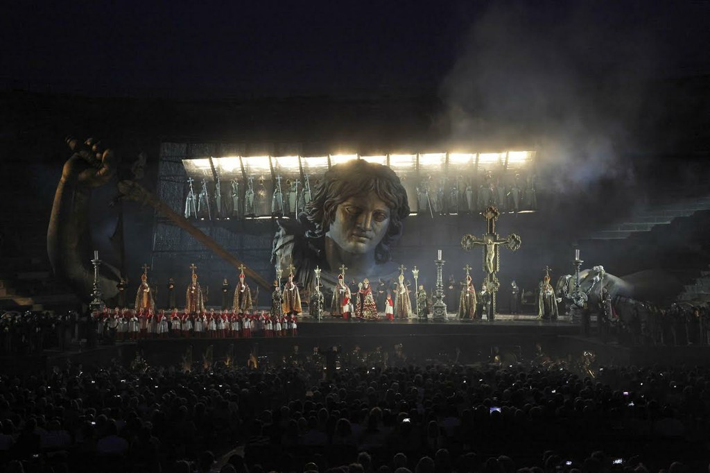 В течение многих лет в Арена ди Верона автор наблюдала работу замечательного аргентинского сценографа и режиссера Хуго Де Ана (как часто бывает, более сценографа, чем режиссера) и всегда эта работу вызывала у нее энтузиазм. Его «Набукко» 2001 года незабываем. Нынешняя «Тоска» при ее появлении в 2006 году была великолепной, к тому же ее украшал звездный состав: Фьоренца Чедолинс - Тоска и Марсело Альварес - Каварадосси. От голоса Руджеро Раймонди уже тогда почти ничего не оставалось, но артист Раймонди в роли Скарпиа был на высоте. И вот постановка Де Ана снова появляется на подмостках Арены, производя странное впечатление.