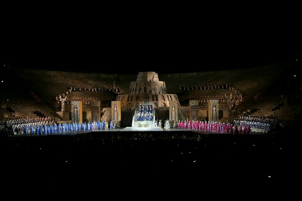 И вот старому «Набукко» пришлось открыть девяносто третий по счету фестиваль в Арена ди Верона. Идея Оливьери поместить в центр огромной сценической площадки вавилонскую башню-зиккурат, вдохновленную известной картиной Брейгеля, и по прошествии многих лет производит эффектное впечатление. В финале башня рассыпается на куски, символизируя моральное поражение жестокого Вавилона (ныне сценография сильно упрощена и облегчена по сравнению с вариантом 1998 года в соответствии с новыми требованиями Археологического управления). Спекталь Оливьери-Де Бозио не имеет ничего общего с «режоперой» и поставлен в доминирующем в Арене стиле kolossal: на огромном пространстве действуют грандиозные массы и большую роль играют такие традиционные для Арены эффекты, как шествия, расставленные симметрично и на одинаковом расстоянии друг от друга артисты миманса, ползущий пар, сверкание молний и пылание факелов. Маститый режиссер, хорошо знающий все особенности и опасности такой уникальной сценической площадки, как Арена ди Верона, умело управляется с бесчисленной армией участников, но спектакль остается серией живых картин. Впрочем, статичность и ораториальность в самой природе третьей оперы Верди, а величественная красота зрелища неоспорима.