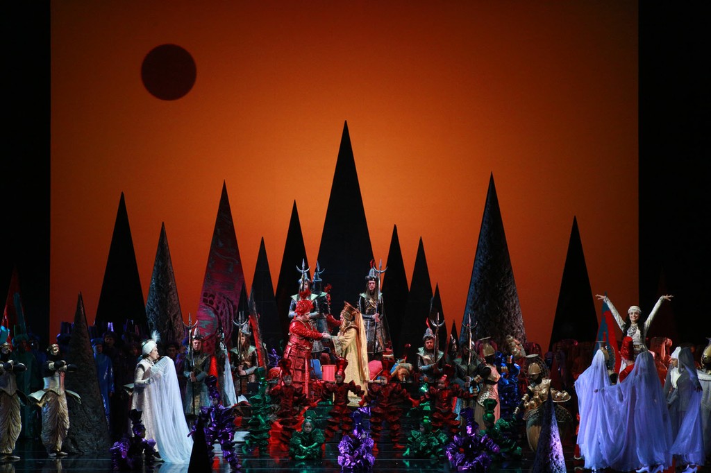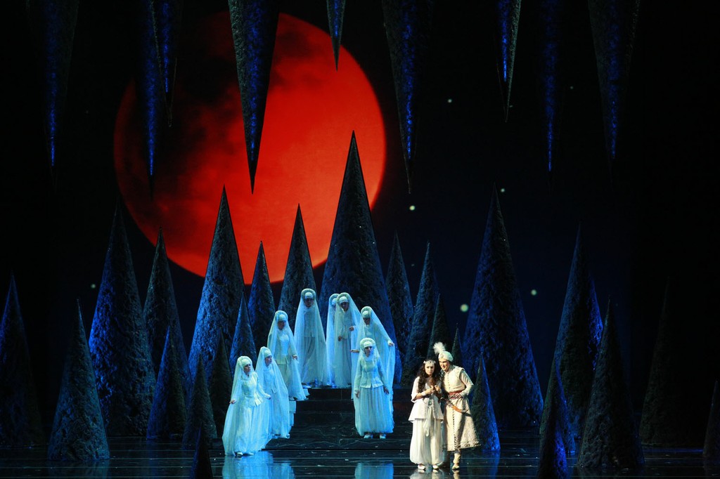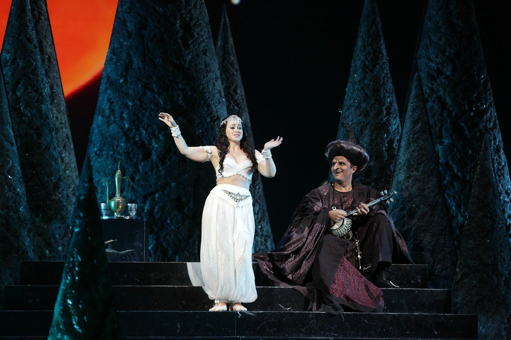 Впечатление от премьерного спектакля делится на две части. Первое действие показалось мне неинтересным, в первую очередь, по музыкальному материалу. Довольно примитивные ориентальные мелодии, бледновато оркестрованные, с совершенно неожиданным для мастера киномузыки отсутствием действенного начала. Здесь Рота пытается походить на настоящего оперного композитора, что у него выливается в довольно невыразительную музыку, весьма вторичную по композиторской технике, с различными отголосками, в том числе Римского-Корсакова. Изредка можно расслышать и что-то пуччиниевское с его ориентальной «Турандот» – ведь и текст сказки начинается так: «был в одном городе из городов Китая портной, живший в бедности, и был у него сын по имени Ала ад-Дин». В первых изданиях сказки Аладдин был китайцем. Но как-то само собой всё действие традиционно перенеслось на более привычный обобщенный арабский восток. Здесь Аладдин напоминает главного героя кинохита сороковых годов прошлого века – «Багдадского вора».