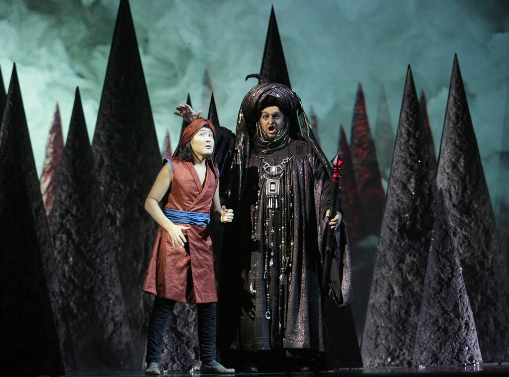 Сопрано Дарья Терехова добилась успеха и в вокальном отношении, и в драматическом плане. Голос у нее чист и прозрачнен. Хорош бас Денис Макаров – злой колдун Магреббин. Сначала он вкрадчиво расспрашивает друзей об Аладдине, потом ласковыми речами входит в доверие матери Аладдина и быстро показывает свою суть, когда не может получить лампу из пещеры.