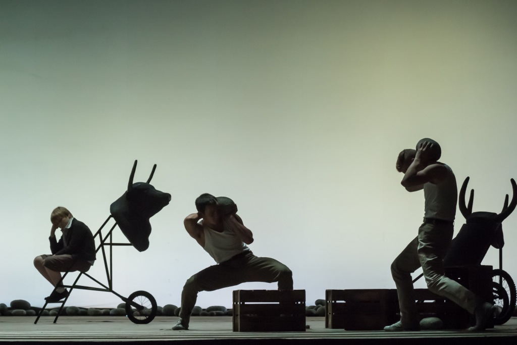 Отдельное слово нужно посвятить сценической визуализации второй части увертюры и симфонических антрактов (в постановке этих эпизодов принимала участие режиссер по пластике Татьяна Баганова). Вот здесь живописная пластика и красота как таковые взяли реванш, хотя и продолжали служить целостному замыслу спектакля. Пред нами предстали молодые мальчики, обучающиеся в школе торреро искусству боя быков. Они занимаются физическими упражнениями (вот еще для чего пригодились на сцене камни), напоминая античных юношей, бегают, вступают между собой в борьбу, используя рогатые тренажеры на колесах, имитирующие быков. В какие-то моменты их движения замедляются, как в рапидной съемке, обретая монументальную поэтичность, затем становятся более динамичными. Оригинально применяются в этих сценах и световые эффекты (художник по свету Евгений Виноградов), в частности задний силуэтный свет (контражур), на фоне которого зритель видит только плоские черные контуры человеческих фигур и предметов, постепенно обретающих плоть и кровь по мере смены ракурса освещения. Что и говорить, антракты – редкостная удача постановщиков. Моментами мне казалось, что надо всем происходящим витает какой-то дух графики великого Пикассо…