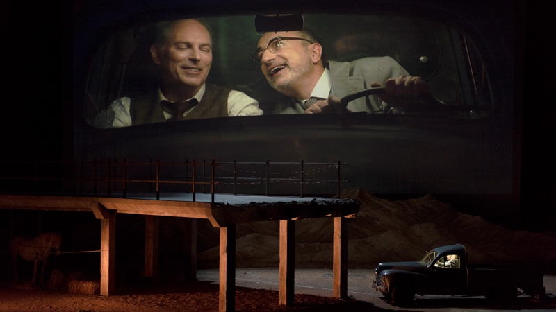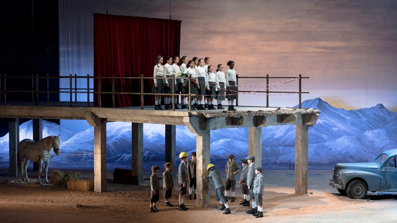 Тем более что в режиссуре Мартона никакими «принципами Глюка» не пахнет. Всё то же, что и обычно. Опять пустынный постапокалиптический пейзаж, как это было в «Орфее и Эвридике». На сцене полуразрушенная платформа — аккурат в том месте, где в «Каприччио» были театральные подмостки. Опять застывшие в неестественных позах хористы, опять много детей на сцене. И Фауст тщетно ищет свою возлюбленную среди множества «не тех» женщин, как некогда это делал Орфей (тут, видимо, у режиссёра какая-то личная драма, отнесёмся с уважением). Опять с потолка спускается фонарь, как в «Каприччио», опять герой садится за письменный стол и всё время что-то пишет, пишет… (Ах, нет, виноват, Орфей — тот печатал на машинке). Опять музыка немузыкально прерывается на полуфразе, и в неё вклинивается посторонний разговорный текст. Если в «Орфее и Эвридике» это были цитаты из Беккета, то в «Осуждении Фауста» артисты импровизировали на темы диалогов из «Фауста» Гёте. Опять герой встречается с самим собой, но юным. И так далее, и так далее.
