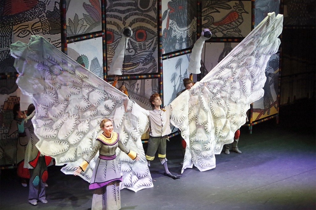 Трогательный, щемяще искренний Утёнок – Иван Матвийчук. Петух и премилый чумазый Бесёнок в грязненькой балетной пачке – Надежда Благова. Ядрёный добрый молодец Балда – Павел Медведицин. Поп и Попадья – Евгений Кулеш и тот же Иван Матвийчук, которым пришлось освоить непростое искусство водить ростовые куклы с прорезью для лиц и руками, двигающимися тросточками. Казалось, всем без исключения артистам нравится такое открытое скоморошество, заводит непосредственная ребячья реакция на их пробежки между рядами, попытки схватить-потрогать персонажей.