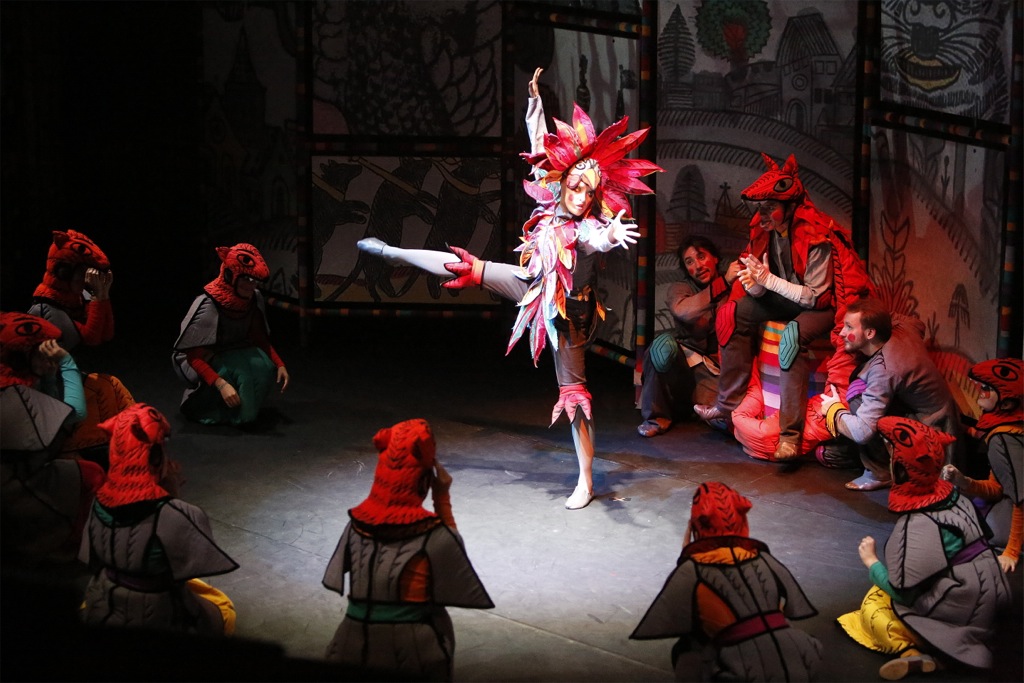 Мало того, что строгий камерный Бетховенский зал, благодаря своему строению (сцена полукругом внизу – ряды вверх амфитеатром) преобразился в некое подобие цирка, с ярким лубочным задником и цветастой фольклорной каруселью, встречающей зрителей. Оказалось, детям здесь всё разрешено! Ну, или почти всё, в рамках безопасности. Бегающие между рядов, прыгающие, кричащие живчики на полукруге сцены перед началом и в антракте – самый лучший «аперитив», настраивающий на правильное восприятие зрелища «их» глазами. После спектакля подумалось – всё тоже самое, разыгранное перед сугубо взрослой «комиссией», наверняка потеряло бы половину задора!