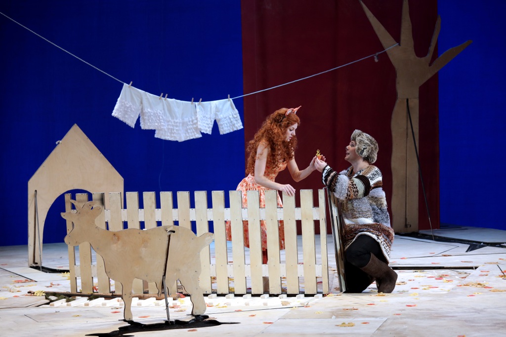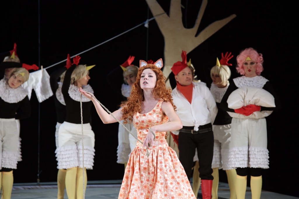 При этом в спектакле подобрался и весьма интересный, довольно сильный ансамбль вокально-актерских работ. В день премьеры 16 октября в нем были заняты Вера Азикова (Лисичка-плутовка), Юлия Макарьянц (Лис-златогривек), Денис Болдов (Егерь), Петр Сизов (Учитель и Комар), Юрий Дейнекин (Пастор и Барсук), Олег Банковский (Гарашта), Михаил Богданов (Пасек и Дятел), Людмила Бодрова (Жена Егеря и Сова), Маргарита Кондрахина (Жена Пасека), Константин Ивин (Пес), Максим Усачев (Петух) и Олеся Титенко (Курица Пеструшка и Сойка). Неперсонифицированный мир людей и обитателей леса музыкально тонко интерпретировался ансамблем солистов оперы и хором театра (хормейстеры – Вера Давыдова и Руслан Генэ).