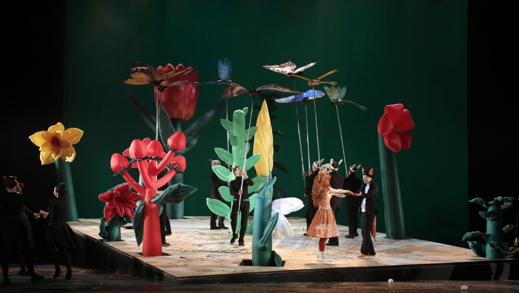 Основная площадка всего действа наклонный к зрителю прямоугольный подиум, на котором сначала ничего нет, но по мере необходимости появляется всё: и лужайка, и строения, и лесное озеро, и деревья. Пространство вне подиума на флангах сцены – это мир неперсонифицированных персонажей – людей ли, зверей ли, – но этот параллельный мир непрерывно вторгается в жизнь, проходящую на подиуме. Мир леса и мир людей отделить друг от друга невозможно, ведь в природе всё взаимосвязано, просто миры эти могут существовать на разных уровнях сознания и взаимопроникновения, и это очень хорошо видно в спектакле. Наблюдая, как «картинки» на подиуме сменяют друг друга с помощью рабочих сцены, мы словно оказываемся вовлеченными в процесс создания «мультика», в котором со сменой картин подмечаем и смену времен года. Очень эффектен контраст между финалом первого акта, символизирующим наступление весны и лесную свадьбу Лисички-плутовки с Лисом-златогривеком, когда всё расцветает в буйстве радостных красок: из проемов подиума буквально вырастают диковинные деревья-цветы и начинают «летать» огромные расписные бабочки.