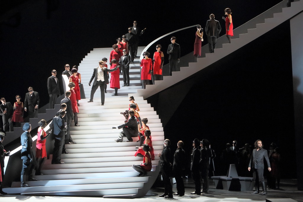Стремился ли режиссер плакатно и вызывающе изобразить средствами черно-бело-красного минимализма, а также иносказательного эротизма сцены «бала извозчиков» картину падения нравов той публики, двойственной морали той социальной элиты, легко заменившей премьерное «браво» на «хайль Гитлер»? Надо отметить, что идея режиссера погрузить спектакль в атмосферу той культурно-исторической реальности предвоенного времени, удалась. Когда под звучание роскошной оркестровой интродукции между вторым и третьим актом (дирижер Филипп Йордан) огромное футуристическое сооружение лестницы разворачивается тылом к публике и сцена погружается во мрак, ощущение первобытного страха не покидает зрителя до конца спектакля.