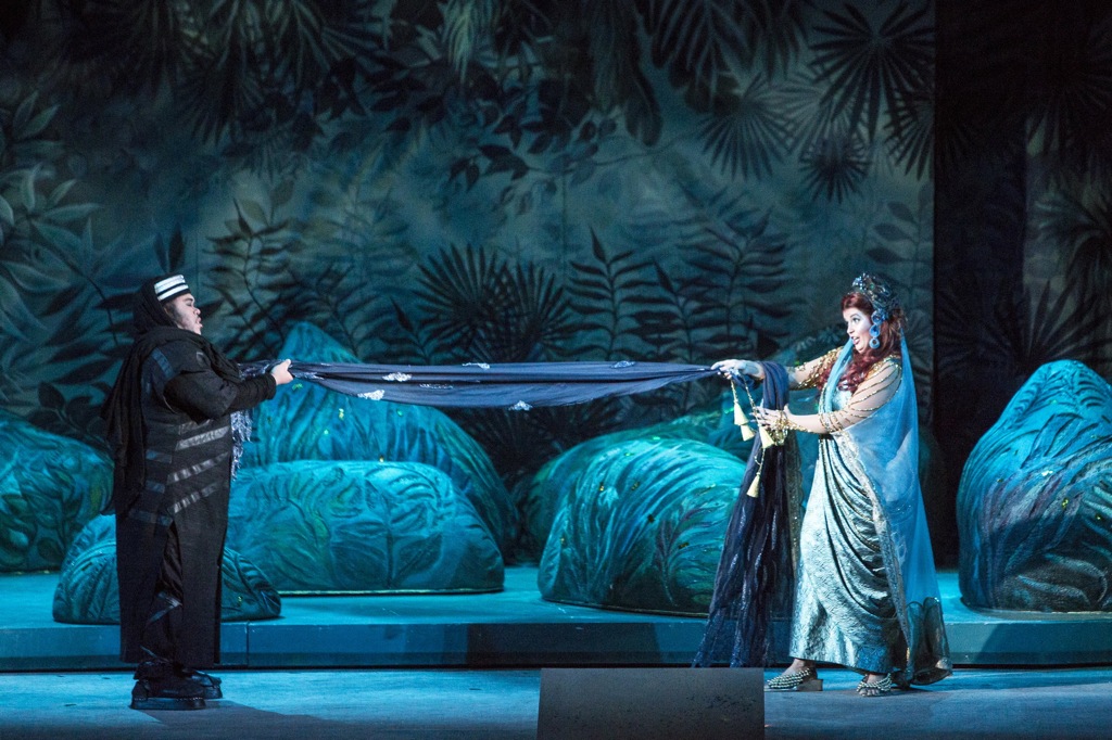 Партию Ассада, можно без преувеличения назвать чрезвычайно сложной, хоть и очень выигрышной для тенора. В свое время Николай Гедда блестяще исполнял романс Ассада «Magische töne», задав очень высокую планку для последующих поколений певцов. Для исполнения этой арии тенор должен обладать легким и непринужденным верхним «до», которое совершенно недопустимо форсировать или, еще хуже, брать фальцетом. Приглашенный специально на эту роль молодой тенор (ему всего 27 лет) Нуттхапорн Тамматхи, уроженец Тайланда, а ныне студент венского Моцартеума, оказался способен в целом справиться с ролью. Увы, небезупречно, в самом начале первого акта он то ли от волнения, то ли по неопытности, пару раз довольно досадно дал петуха в, казалось бы, не самых сложных вокально местах. Но потом полностью реабилитировал себя, продемонстрировав действительно замечательные вокальные данные и искреннюю актерскую подачу, компенсировавшие его специфическую фактуру и отдельные недостатки. Роль царя Соломона исполнил Золтан Келемен – обладатель благородного драматического баритона тоже проявил себя исключительно достойно. Небольшая партия рабыни Асарот весьма непроста для исполнения – эту любовную песню, которую рабыня по приказу своей госпожи Царицы исполняет без музыкального сопровождения, композитор снабдил довольно замысловатым музыкальным рисунком. Каталин Тёркей с честью преодолела все технические барьеры своей партии.