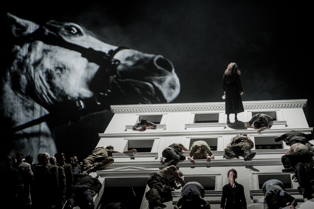 А декорации (сценограф Ребекка Рингст) достаточно милы. Вначале это светлый испанский городок с многочисленными фасадами белых домов, в конце – поверженный, не разрушенный, но с накренившимися, завалившимися набок туда и сюда зданиями. Но и здесь оказалось предостаточно нелепостей: в третьем акте выстрелом в голову вдовушка Прециозилла добивает пленных, и она падают на краю сцены. Но потом мы обнаруживаем их (через минуту темноты в зале) в самых невероятных позах в окнах наклоненной (падающей) стены как бы разрушенного здания.
