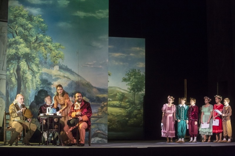 Начнем с первого впечатления, которое возникает при взгляде на сцену, стоит занавесу подняться, открывая зрителю дорогу в художественное пространство спектакля. Визуальная составляющая в такой камерной и эмоционально утонченной опере играет весьма значимую роль. Чрезмерный гротеск или блеск могут легко превратить происходящее на сцене в фарс. Художник-постановщик Балаж Хорешни проделал изумительную работу. Без сомнения, это одна из наиболее удачных постановок в плане сценографии из всех, что мне довелось увидеть на сцене Будапештской оперы за последний год. Камерность и изящество были удачно поддержаны декорациями, которые скорее создавали фон, похожий на акварельные иллюстрации к старинной книге, в большей степени, нежели реалистичную среду для актерского существования. Очень интересным оказалось сочетание абсолютно классических, пастельных и воздушных картин выплывающих из туманного заднего плана, с современными, почти коллажными четкими формами, напоминающими то суровую архитектуру старинного дома, то своды католического собора или крыши в небольшой мансарде. Профессиональная работа со светом и фактурами позволила создать разнообразное в эмоциональном плане пространство, динамика которого легко менялась и трансформировалась вместе с действием за счет совсем небольших изменений. Отсутствие избыточности и тяжеловесности декораций как нельзя лучше подчеркивали характер произведения.
