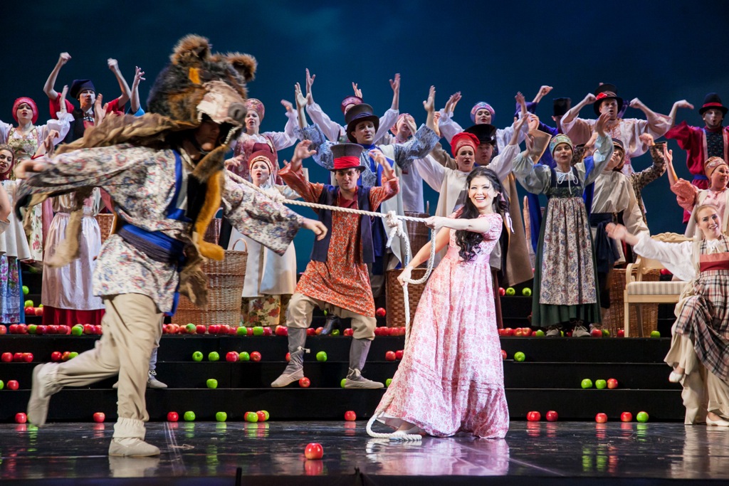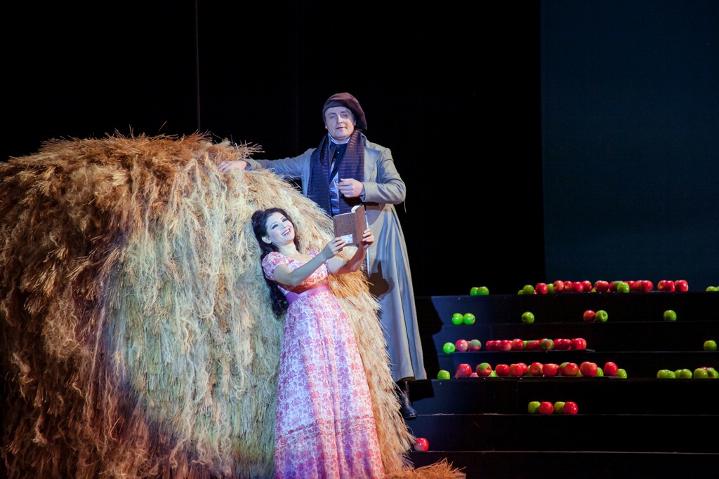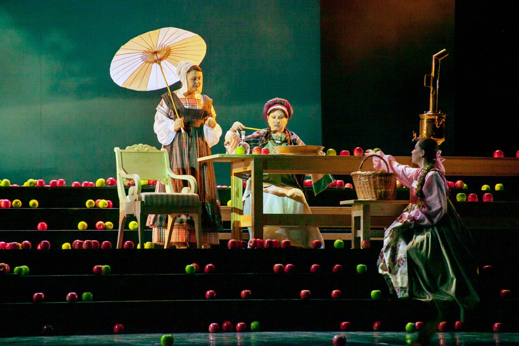 В ней на фоне ярко-голубого задника неба – уже настоящее яблочное раздолье. Деталей сельского быта немного: стог сена, самовар, садовые качели, утварь для переработки и складирования яблок. Их – целое море: они беспорядочно разбросаны по сцене на лесенках сценических конструкций, и этих бутафорских яблок – хотя и кажется, что они настоящие! – настолько много, что героям оперы, постоянно перемещающимся по сцене, не задеть их невозможно. И на тот случай, если яблоки случайно выкатятся на авансцену, на ее краю предусмотрена лунка – прямо как в бильярде! Но загнать шар-яблоко в лунку – вовсе не самоцель: это может случиться, как было на премьерном спектакле, а может и не случиться…