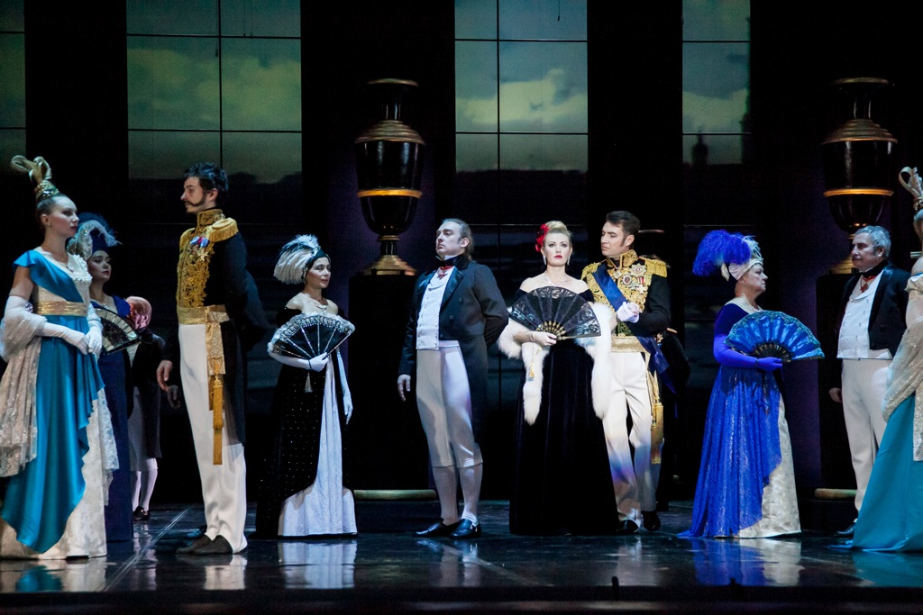 Парадокс, но абстракция сценографии новой постановки зиждется на явно выраженном историческом реализме, а в основе этого сценографического реализма лежит очень точно найденная символическая абстрактная фактура. Немалую роль в восприятии этой исторической абстракции играют совершенно изумительные костюмы, очень тонко и с большим вкусом стилизованные под эпоху. Этот спектакль – ретроспекция со стороны главной героини: все события оперного сюжета предстают перед нами, словно в ее воспоминаниях, и пространство на авансцене перед промежуточным черным занавесом, поначалу скрывающим происходящее во всех «лирических сценах» оперы, – это пространство Татьяны. С него опера начинается – им и завершается, и оно по ходу спектакля возникает, как символический рефрен. Финальная сцена Онегина и Татьяны разворачивается именно в нем, и это уже не ретроспекция, а жестокая реальность разбившихся надежд, осколки которых склеить невозможно…