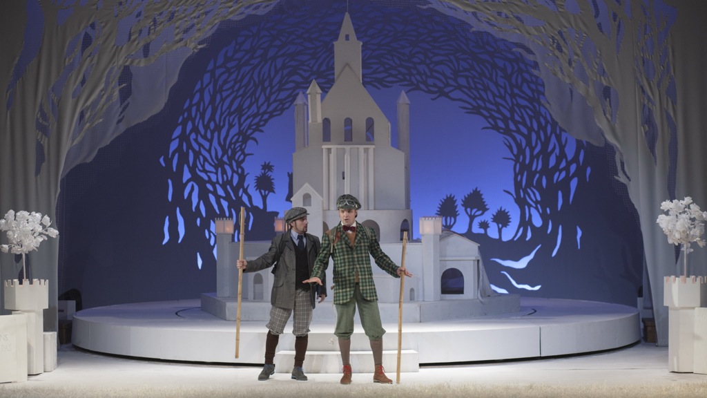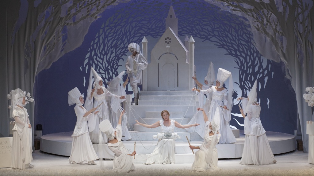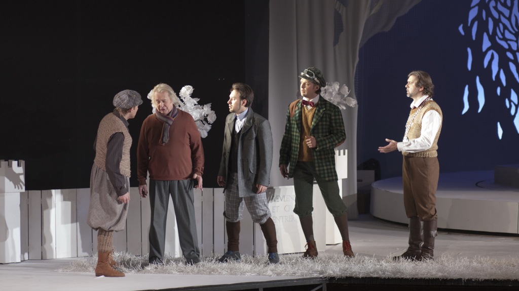 Если же рассматривать это зрелище как серьёзное режиссёрское решение достаточно сложной оперы, то белая стерильность существования Иоланты - это не ахти какой оригинальный, но образ. А вот лукавые игры со средневековьем хоть и привлекательны внешне, по сути ничего не прибавляют. Что, собственно, незрячей девушке этот маскарад? Зрителю, конечно, приятна красивая картинка со стилизованными белыми облаками, кустами светящихся, нарочито искусственных белых роз и детскими лошадками. Вероятно, это обозначает, что жизнь Иоланты не настоящая, а игрушечная. Но почему в эти игрушки играют окружающие? Зачем нормальный бюргер Рене, приехав в своё горное поместье, обряжается в одежды сказочного короля? В чём фишка-то, если говорить по-современному? Кого разыгрывают?