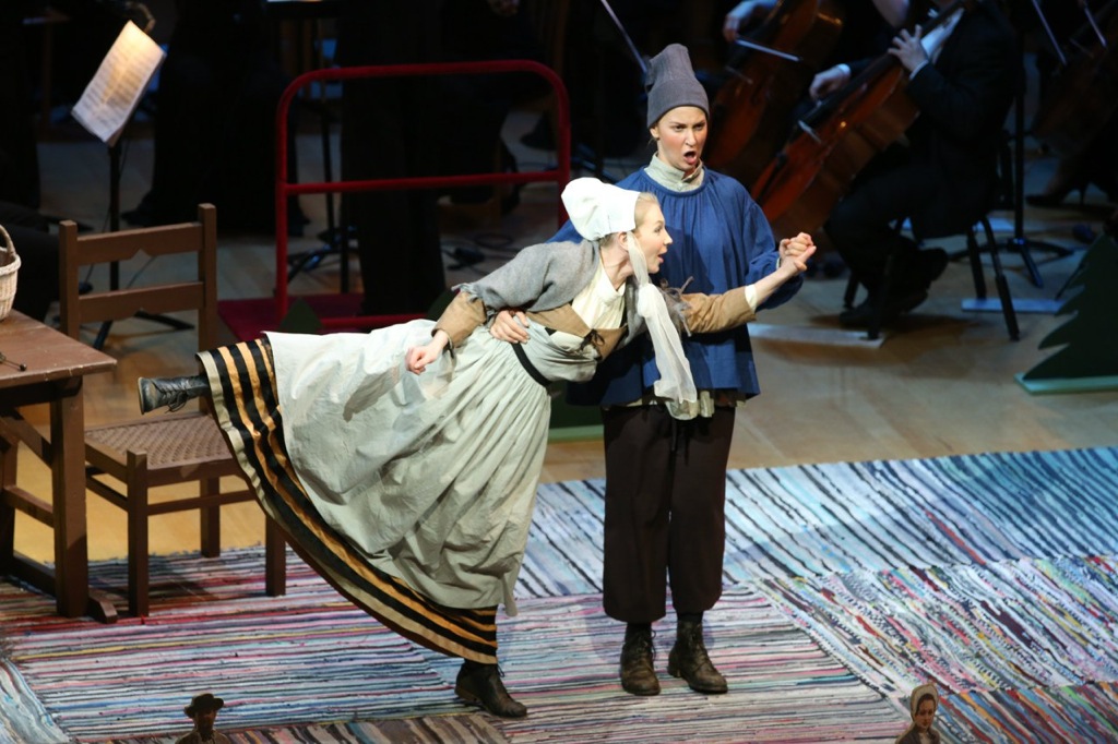 Буквальность соблюдена и относительно использования термина «полусценическое исполнение». Публика вовсю шутила на эту тему на премьере. Постановка действительно занимает лишь узкую тесную полосу просцениума, поскольку основную часть сцены занимает оркестр. Теснота выносит сценическое движение частично на лестничные спуски партера, заставляет сценографию Сергея Грачева быть максимально сдержанной и диетически незамысловатой. Предметы служат лишь якорями, обозначениями места действия, остальное детям предлагается дофантазировать самим.