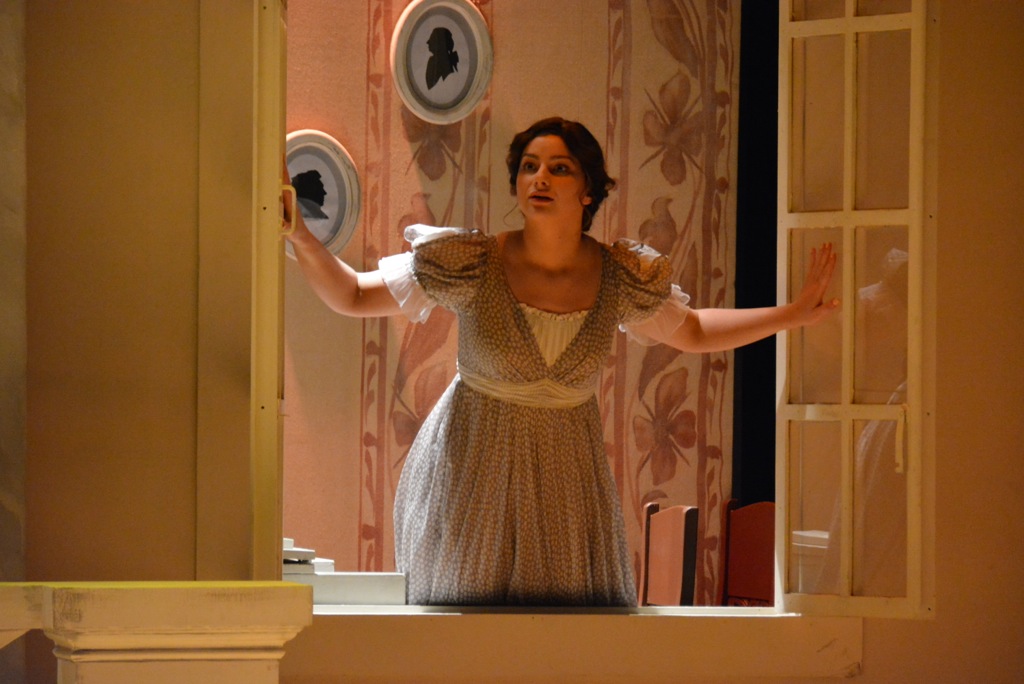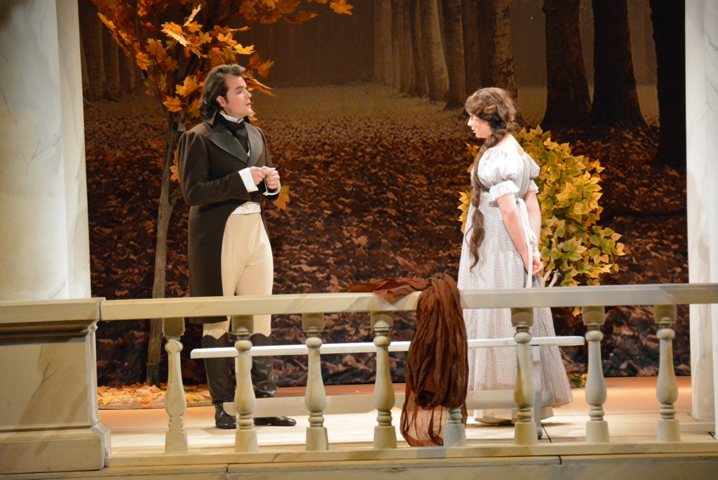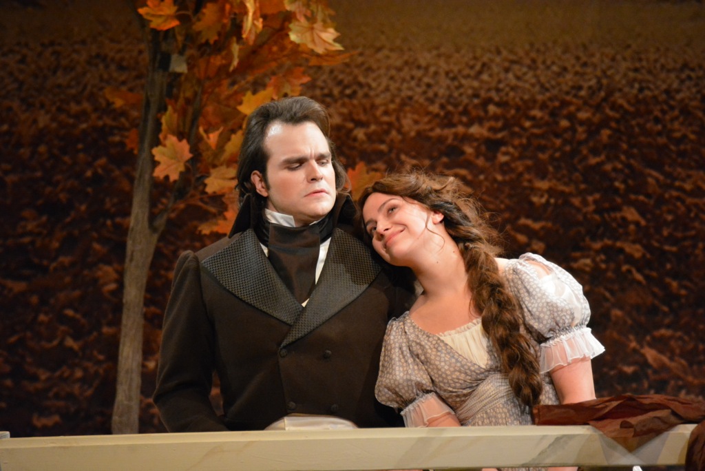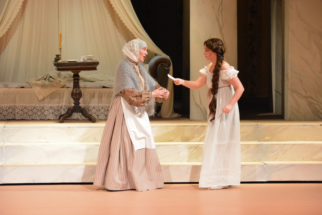 Излишним форте грешил и Дмитрий Скориков (Зарецкий, Ротный). Может, в новом Геликоне акустика слишком хороша, провоцирует всех показывать своё alto voce? Могучим голосом наделена и Няня у Ольги Спицыной. Но вот ей эта «матёрость» не помешала. Филиппьевна хоть и седая, но бодрая сильная «большуха» средних лет, держащая на себе чуть не всё хозяйство. Потому как помещица Ларина – Наталья Загоринская, пригожая под чепчиком, как поздняя осенняя роза, вся в мечтах молодости, в прежнем веке галантных воздыханий. Её подчёркнутые заигрывания с потенциальными зятьями выражались несколько фривольными жестами. Режущим слух характерным голосом и шаблонными ужимками запомнился француз месье Трике – Дмитрий Пономарёв.