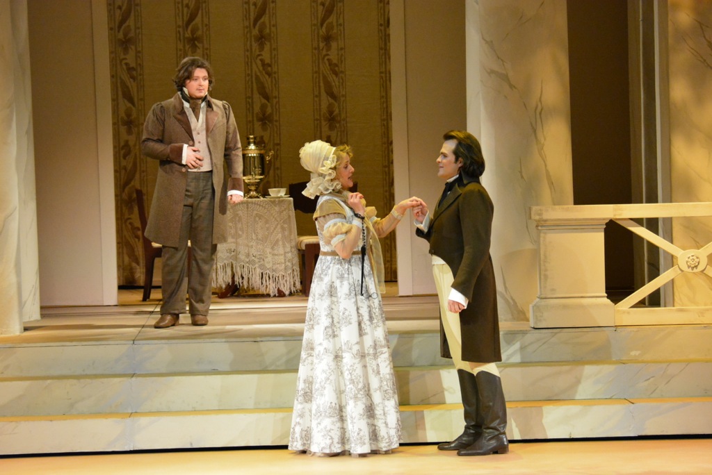 Самая большая удача именно этого премьерного спектакля – приглашение новой солистки из Санкт-Петербурга Ольги Толкмит на партию Татьяны. Сопрано именно такое, как мечтается для любимой героини – свежее и молодое, но уже сочное, с «мясцом», явно с тенденцией к более драматическим партиям в дальнейшем. Прекрасная вокальная выучка, владение нюансировкой, неплохая дикция. Легко простились даже вольности с текстом в «Письме» - то чуть напутала слово, то фразу «судьбу мою отныне» спела на «траляля», с кем не бывает! В целом слушать отрадно, смотреть – ещё интересней. Такой Татьяны, пожалуй, не встречала. Вопреки расхожему, слова Няни: «моя вострушка, весёлая и резвая ты пташка» могли быть обращены и к Тане тоже. Она с первого выхода вся пульсирует активностью, жаждой жизни, узнавания нового. Ничего меланхоличного, сцена Письма – придуманное приключение начитанной девушки. И ведь вправду надо было иметь дерзость и отчаянную голову в 1819-м году (время действия романа), чтобы самой, первой написать письмо однажды встреченному «соседу»! Не пугает эту Татьяну даже суровость Онегина, читающего ей отповедь в саду, она продолжает чуть не мурлыкать просто от возможности видеть рядом любимого, сидеть с ним, доверчиво склоняет голову на плечо Евгения на последних звуках арии «...лёгкие мечты». Надутые губки на именинном балу – лишь позёрство, игра в томность. Невольно вспомнился чуть ли не антипод русских романтических героинь - Скарлетт О’ Хара из «Унесённых ветром» с её неубиваемым оптимизмом и практичностью. Вдуматься, нет здесь никакого противоречия. Добавлю - у Ольги Толкмит благодатная сценическая внешность, незаурядные актёрские данные. Стройная, подвижная, легко преображающаяся гримом из бутончика-барышни в опустошённую не тем замужеством очень зрелую даму с угасшим взором сильно подчернённых глаз, напоминающих кинодив немого кино.
