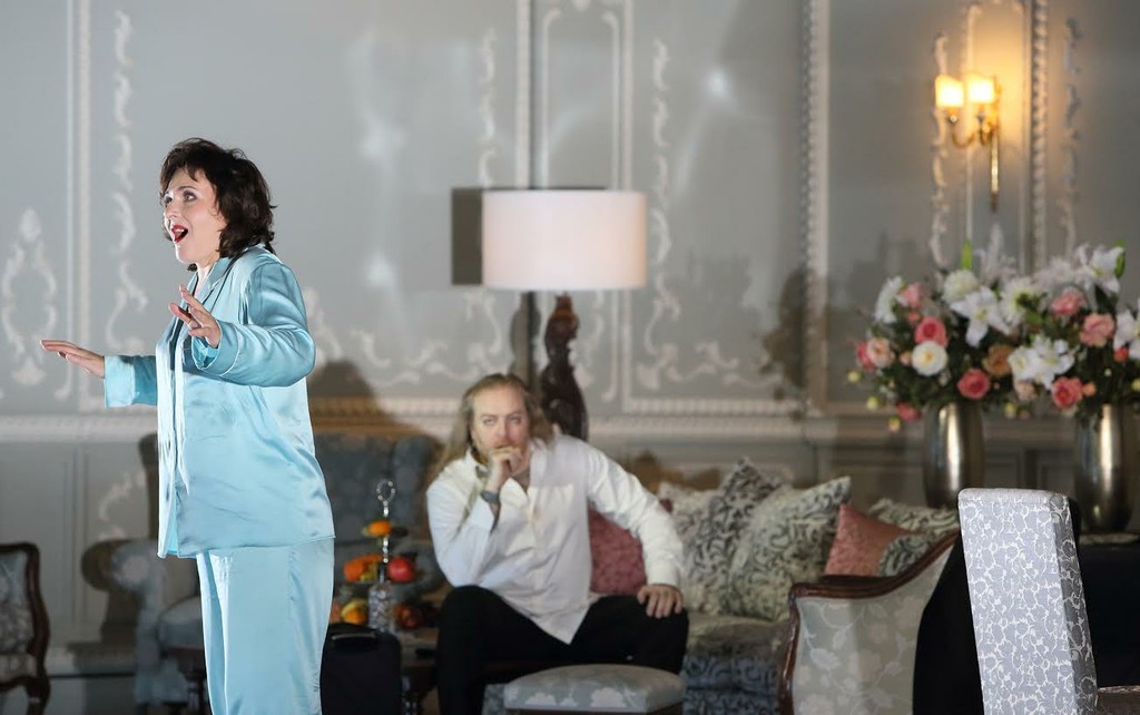 Новую игру инициирует Рупрехт, бросая в лицо Ренате костюм мальчика. Очередное наваждение даже Фрейду могло бы присниться лишь в страшном сне: невозмутимо спокойный Фауст при макияже, в кружевных трусиках и чулках (молодой украинский бас Игорь Царьков) — новыми смыслами наполняется звучащая из его уст фраза «Человек сотворен по образу и подобию самого Творца», — клоун-весельчак Мефистофель, не скрывающий своих мужских достоинств, и стайка юнцов, разодетых в костюмы из секс-шопа, с щенячьей преданностью прислуживающих хозяевам. И хотя степень провокационности этой сцены местами зашкаливает (особенно если всмотреться в сценки на заднем плане), Коски удается сохранить главное — фарс и буффонаду. До невозможности обаятельный Кэвин Коннерс в роли Мефистофеля дурачится, как ребенок, и прекрасно поет по-русски, раскатисто смакуя «Вина и бар-р-ранины!»