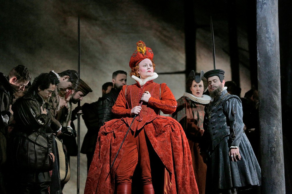 А про постановку скажу лишь, что она была проста и без затей. И сценография, и костюмы, и все действие были там, где надо – в Англии 16-го века. Вообще никаких намеков на современность, никаких новейших штучек. Зато режиссер Дэвид Мак Викар ( его последняя работа в Мет. – «Трубадур», где на премьере выступали Анна Нетребко и Дмитрий Хворостовский) – безусловный мастер работы с актерами. Образ Елизаветы – гротескный и страстный, порой смешной, порой страшный – абсолютно необычный для оперной сцены. Обычно все-таки в опере 19 века все как-то более или менее делятся на хороших и плохих, на героев и злодеев. А тут вот такая королева, зловещая, коварная, а вдруг расшалившаяся девчонка… ее пластика, ее руки и ноги как на шарнирах – высокий актерский класс, пантомима под стать какому-нибудь Марселю Марсо. Если учесть что при этом она поет вокальную партию огромной сложности, с огромным диапазоном, от меццо до колоратуры – нельзя не восхититься.