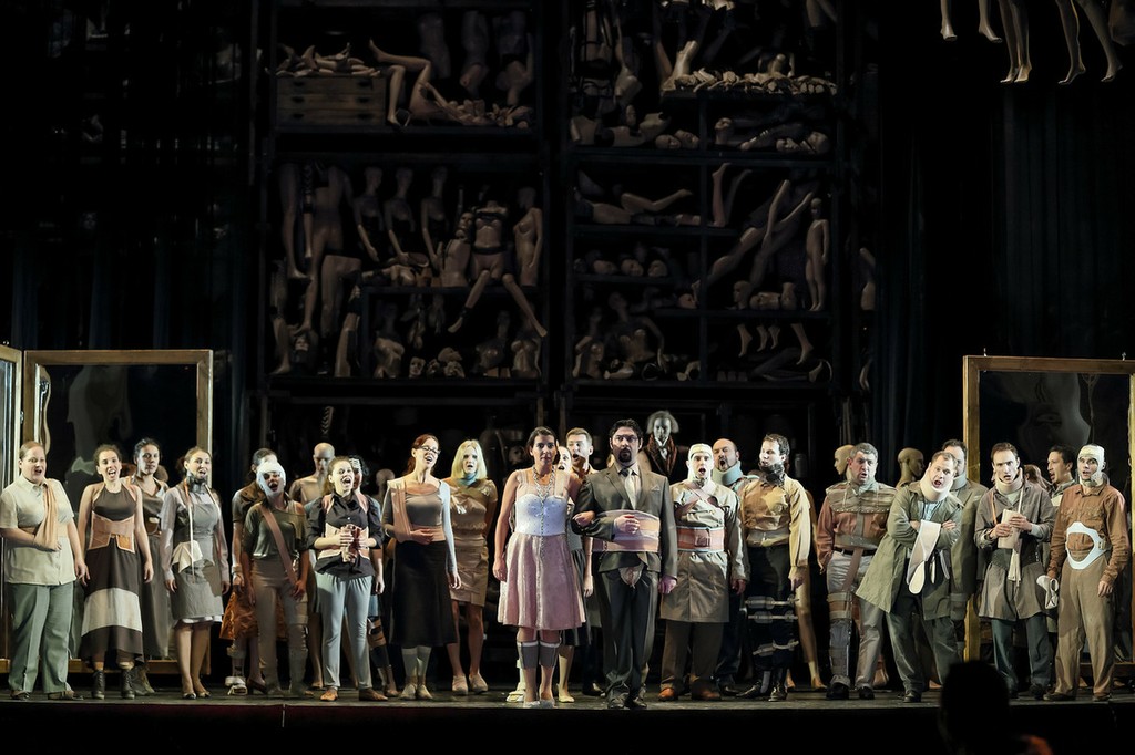 В общем, даже невозможно оценить, вдоль или поперек сюжета Моцарта-Да Понте прошлась режиссерская мысль, потому что по факту одна единственная большая сцена «Живой Дон Жуан и его коллеги против неживого общества» - это все, что есть в спектакле, единичная идея, растянутая на весь обширный музыкальный материал. Притом что персонажи на сцене постоянно и шумно взаимодействуют, двигаются, ворочают многочисленные манекены, ничего смыслообразующего по существу пред нами не происходит. Не говоря уже о том, что начиная с грохота от сброшенного сверху манекена на самом первом аккорде увертюры, посторонних звуков из-за этого (и это поверх и так негромких жильных струн и хаммерклавира!) критически много.