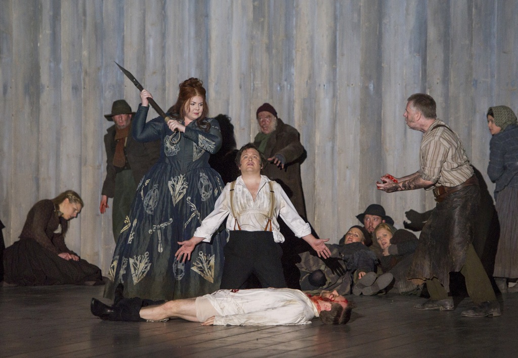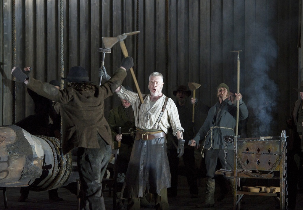 Декорации Чарльза Эдвардса ключа к понимаю происходящего также не дают. Огромный дощатый сарай на всю сцену, парочка окон почти под крышей, посреди – огромных размеров бревно, которое кто-то стругает, а кто-то царапает на нем какие-то надписи. И увидеть в нем священное дерево, на котором произрастает омела, обладающая для друидов таинственной магией и без веток, которой не совершаются никакие обряды, честное слово – трудно, если не невозможно. Эти декорации не меняются все четыре акта.
