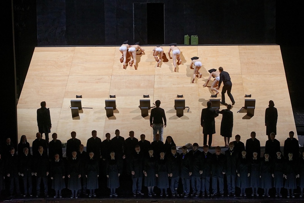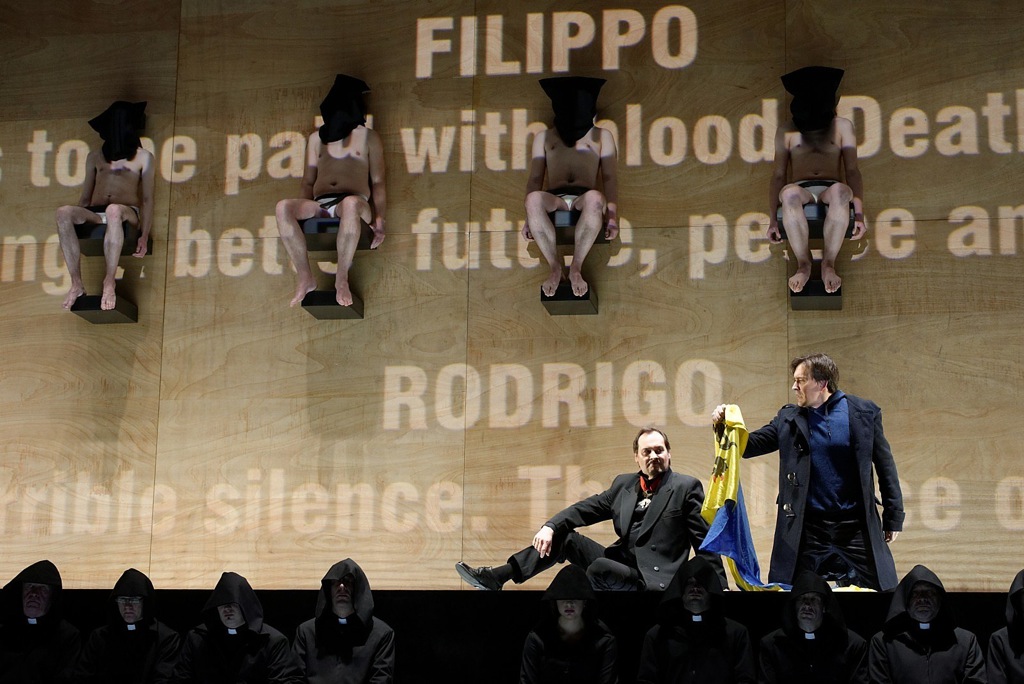 Все четыре действия оперы разворачивались на фоне одних и тех же декораций – светлых деревянных щитов, сверху донизу закрывающих сцену. Для сценического действия была оставлена узкая площадка перед оркестровой ямой, представляющая как бы две ступени. Именно на них в финале второго действия постановщикам удалось разместить и хор, и фламандских депутатов, и солистов. Примерно на высоте двух метров над сценой в щиты были вмонтированы шесть сидений. В первых двух актах там находились полуобнаженные артисты миманса с мешками на голове, изображающие приготовленных к аутодафе еретиков. После антракта четыре из шести сидений были уже пусты, а два крайних «места для мучений» заняли маркиз ди Поза и Дон Карлос. Два раза на протяжении всей оперы щиты опускались, открывая всю глубину сцены. Один раз по этой наклонной плоскости поднимались еретики к месту казни, второй раз по ним спускались солисты в начале третьего действия. Иногда эти щиты становились экраном для видеопроекции: так, на них в самом начале оперы зрителям были представлены цифры жертв инквизиции в самых крупных городах Испании.