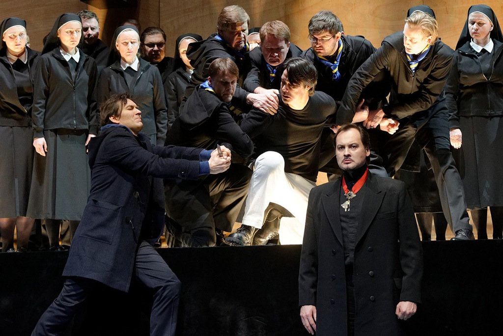 Нетрадиционным оказалось решение образа Дона Карлоса. Большую часть своего пребывания на сцене этот персонаж одет в смирительную рубашку, на глазах у него такая же повязка, как у Дэвида Боуи в клипе композиции «Lazarus» из последнего альбома «Blackstar». Предоставлю знатокам творчества Боуи гадать, как образы последнего альбома британского музыканта могут быть связаны с сюжетом оперы и судьбой Карлоса. Возможно, в этом есть намек на болезнь, которая пожирает принца изнутри (в вильнюсской постанове Карлос умирает под капельницей; интересно, вещество бирюзового цвета, которое в ней находилось, – лекарство или яд?). Действие, которое разворачивается на сцене, не дает однозначного ответа: психические проблемы Карлоса врожденные или инфант был изначально здоровым человеком, которого за вольнодумство «для профилактики отправили подлечиться» в закрытое учреждение? Если режиссер решил наделить оперного героя чертами исторической личности, то насколько удачна такая идея? Да, реальный инфант имел серьезные проблемы с психикой, но ведь не таков герой трагедии Ф. Шиллера и оперы Дж. Верди! Иначе получается парадокс: единственная надежда угнетенной Фландрии, ее спаситель – человек, мягко выражаясь, не совсем адекватный?!